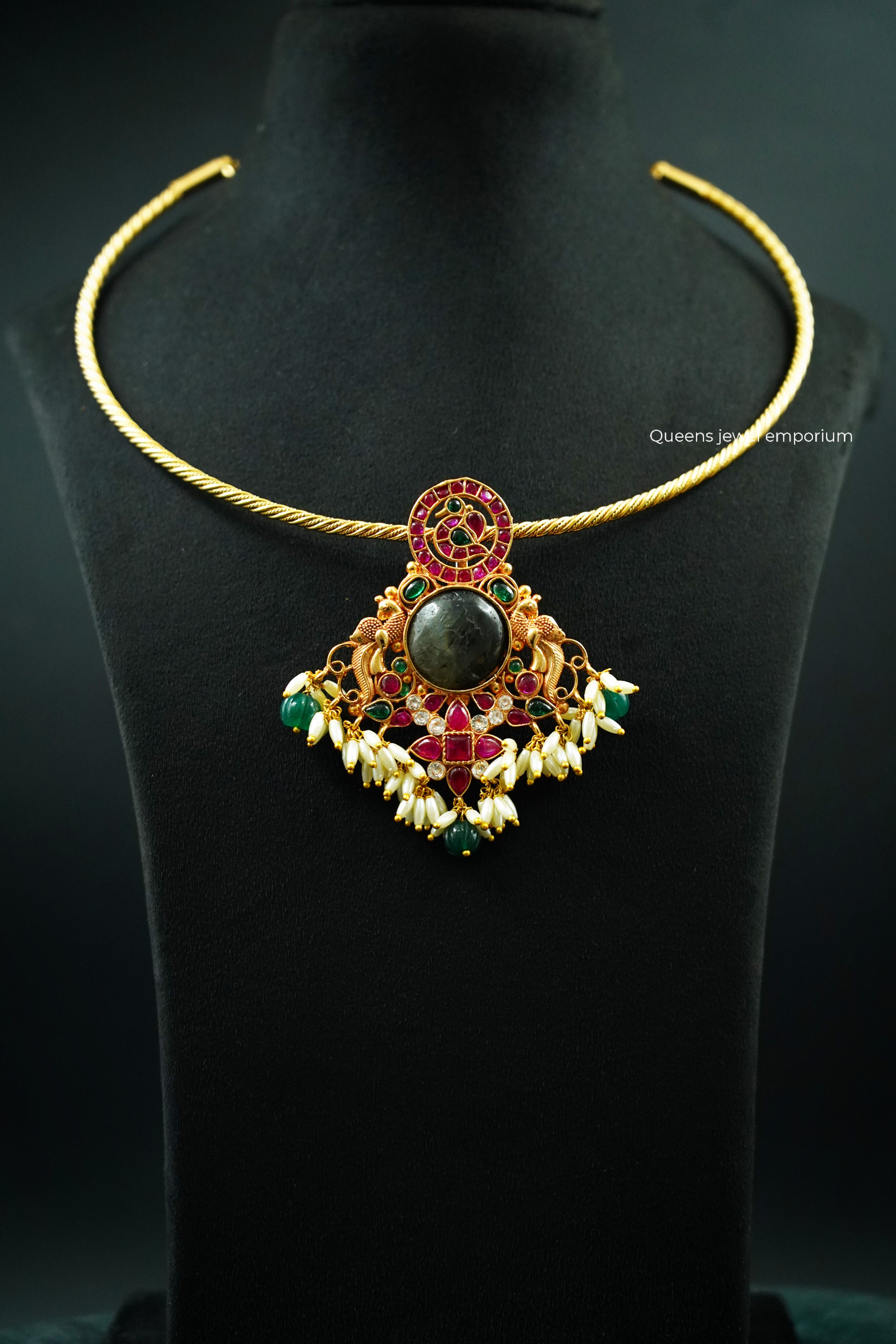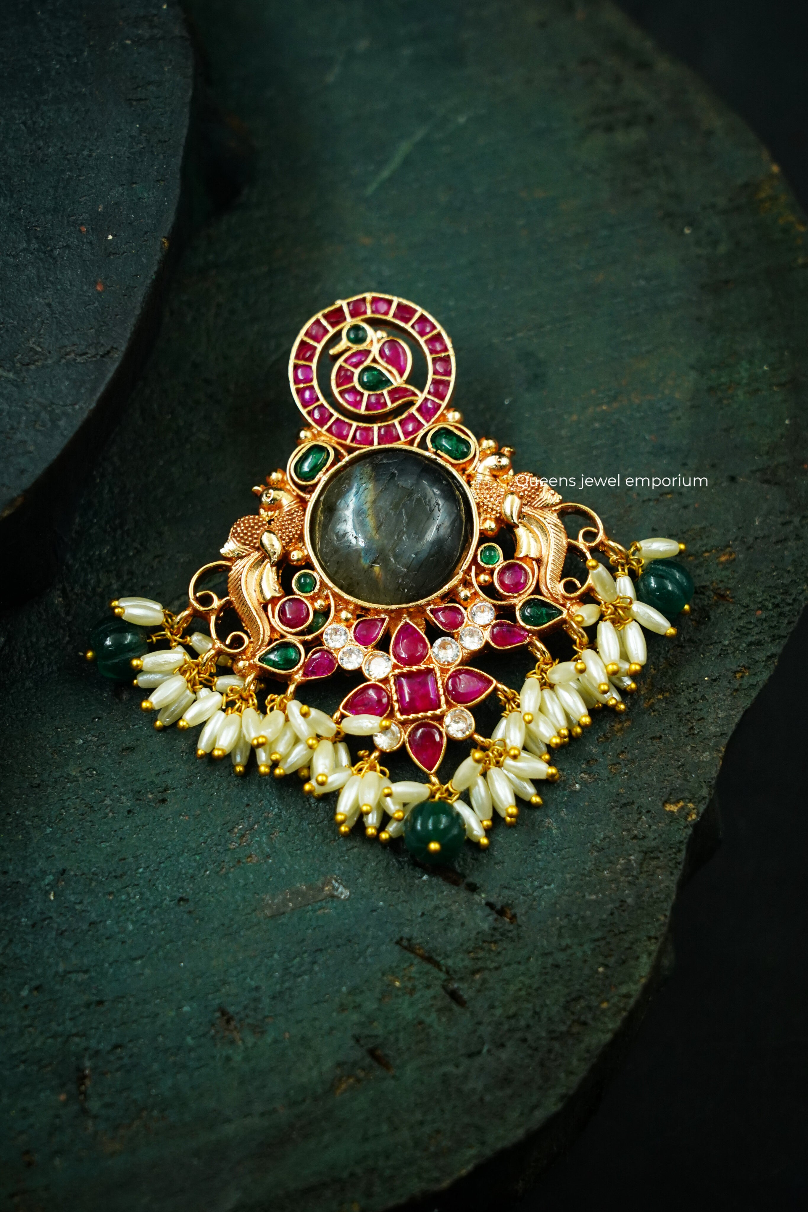 Natural labradorite stone in center with two nagas kizhi motifs on sides and chakra motif on top, set in floral design adorned with red and green kemp stones, finished with onyx green beads and rice pearl hangings. A divine pendant, handcrafted by Queens Jewel Emporium for timeless splendour.