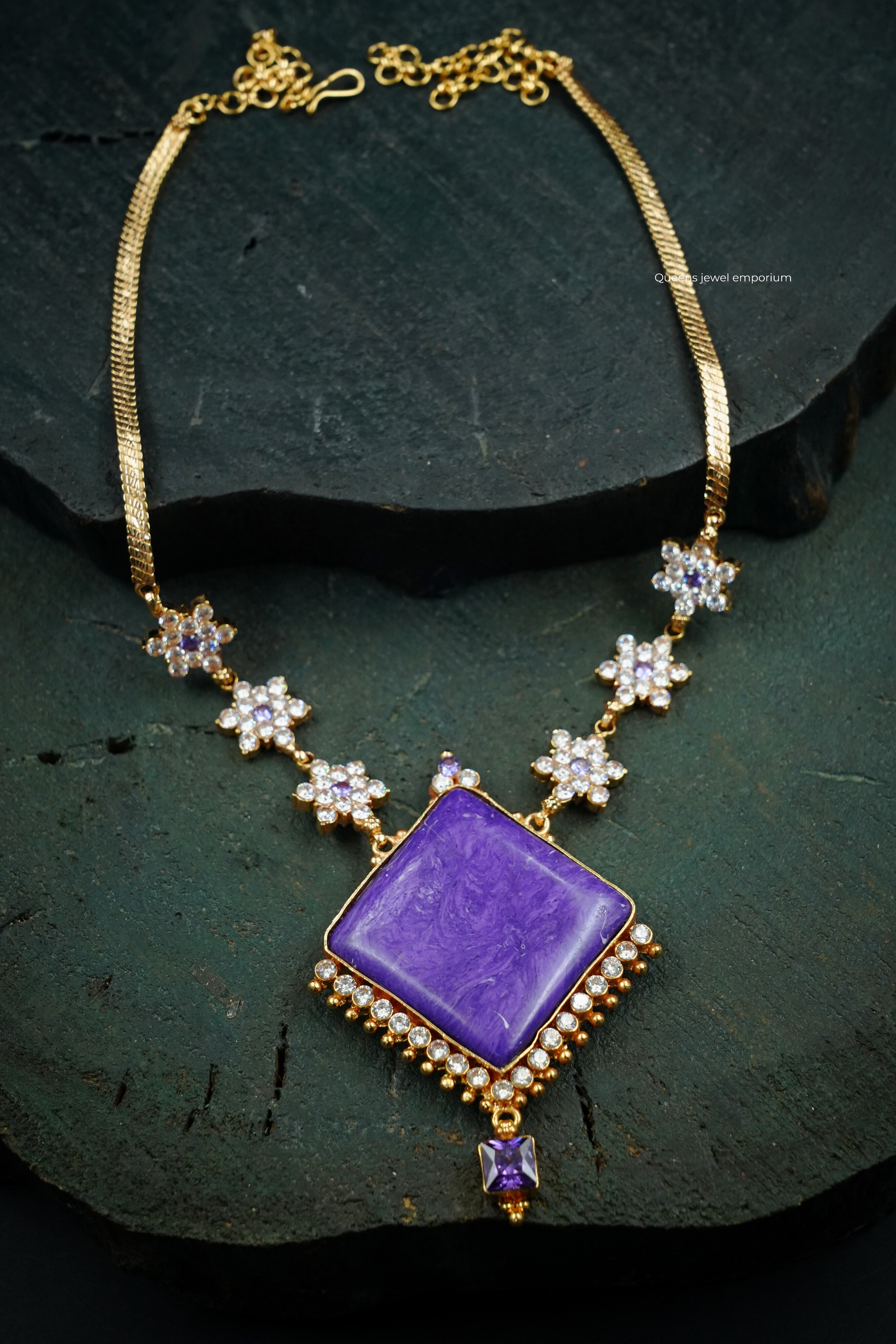 Square designer necklace with charoite purple stones, detailed six-star motifs, and elegant purple square hangings—crafted to create a bold, eye-catching statement.A perfect blend of modern design and royal elegance, this piece from Queens Jewel Emporium is made for women who love to stand out at every occasion.