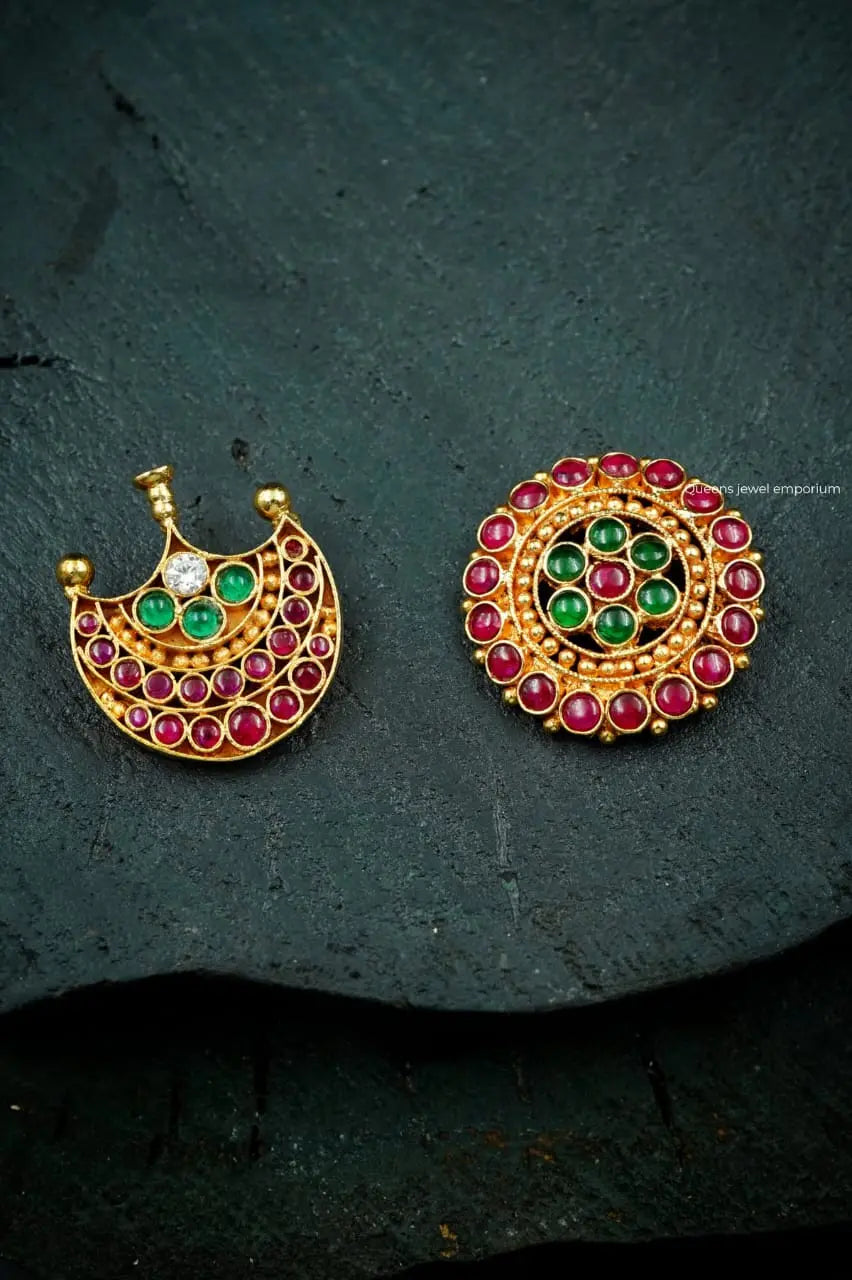 Indulge in stunning design and rich colors with our kemp saree pin. Expertly adorned with vibrant green and Balaji pink kemp stones, it's the perfect touch of elegance for any outfit.