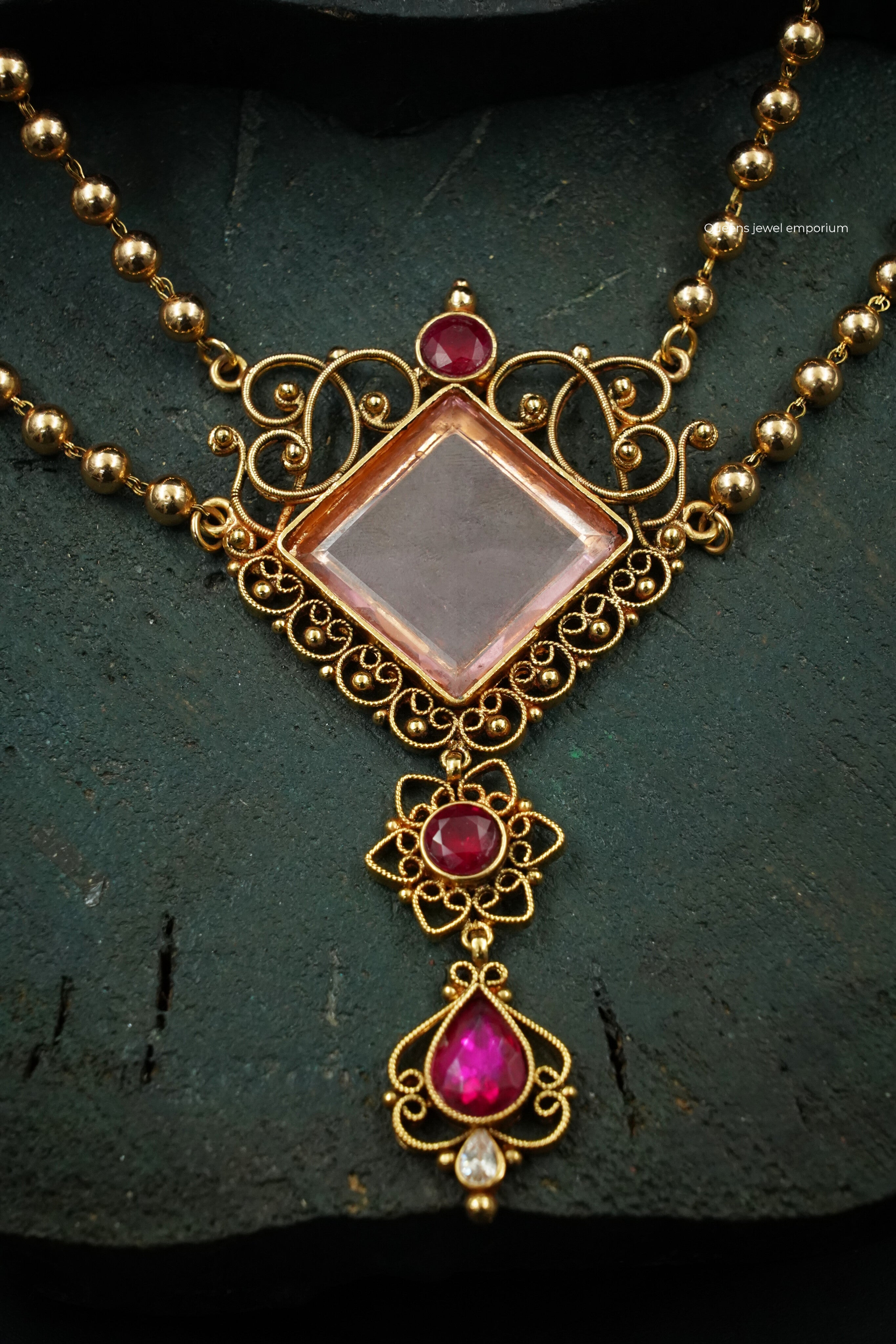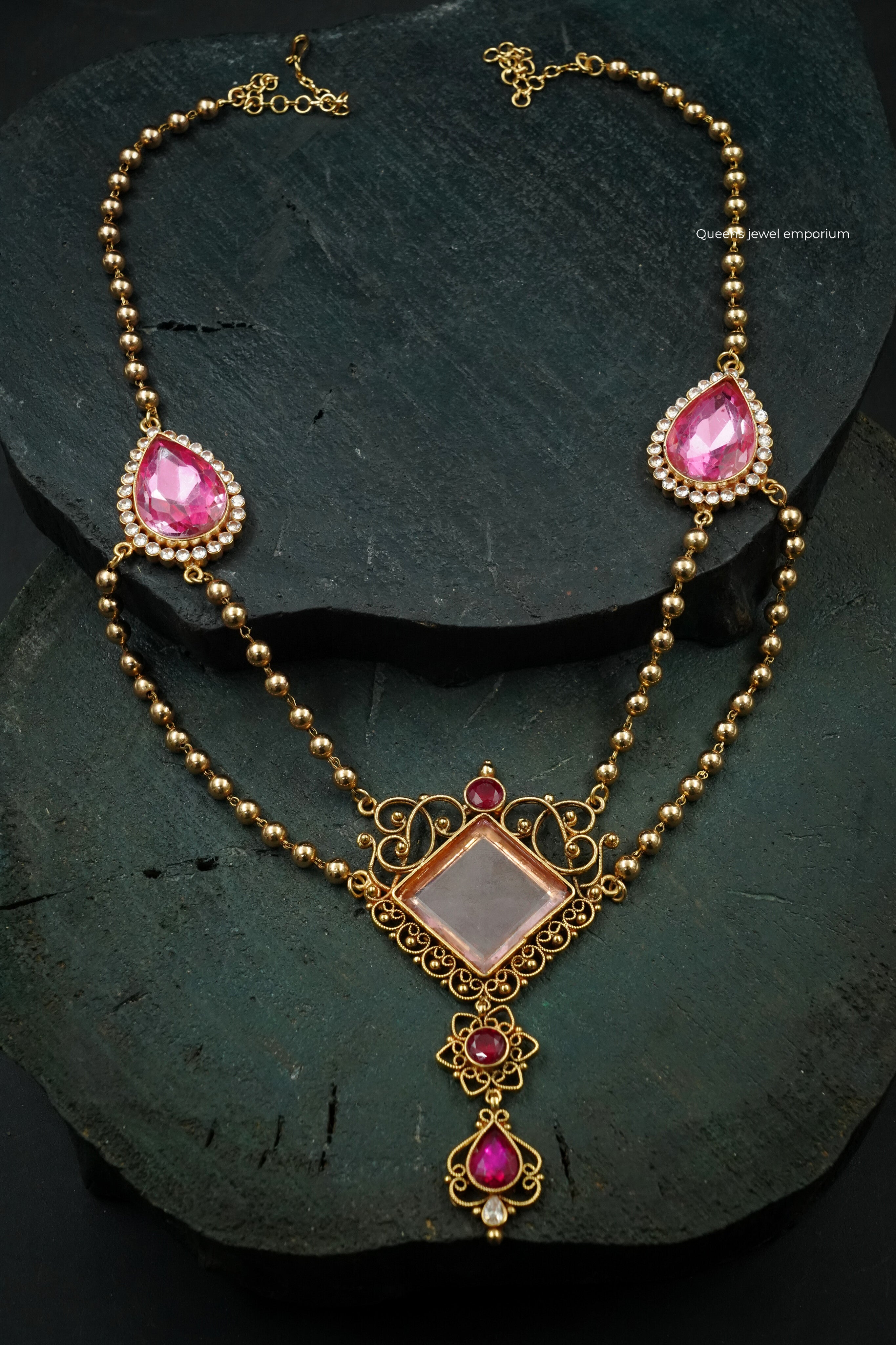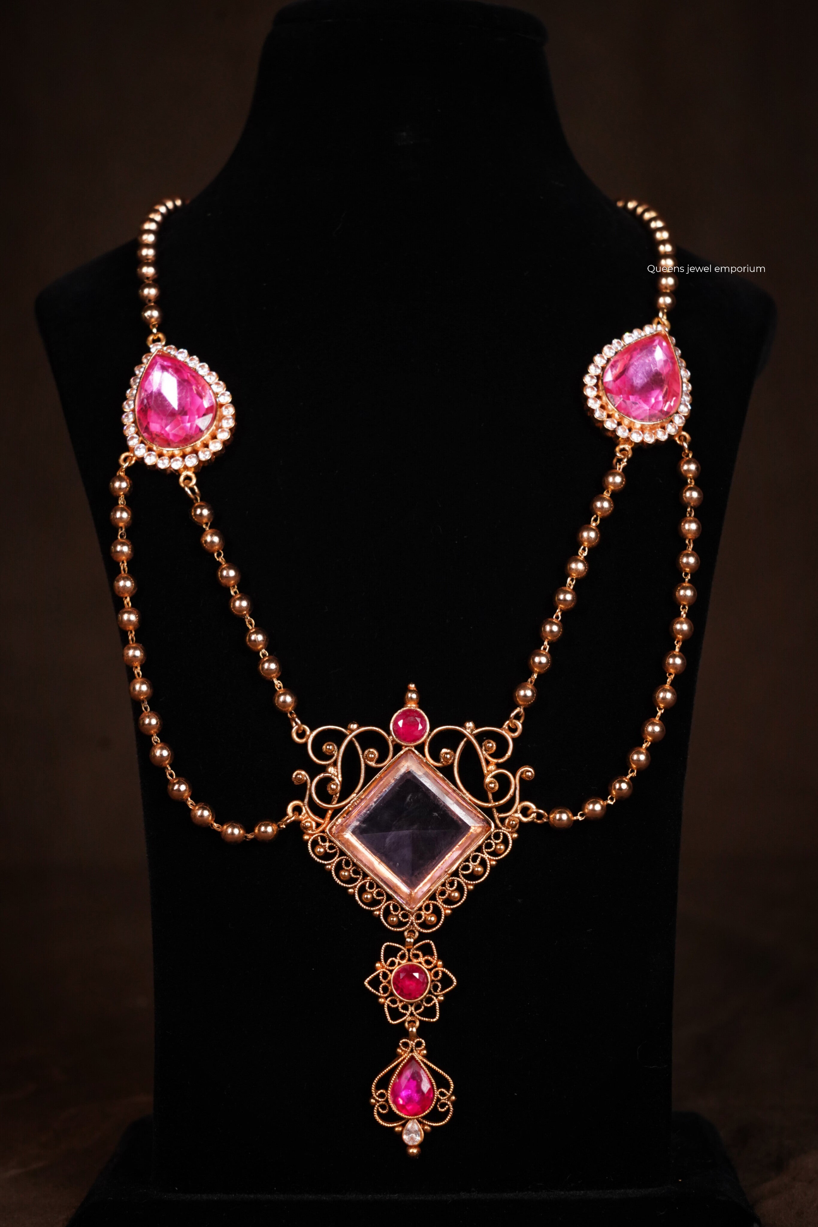 Presenting the Victoria Rose Haram, crafted in true Victorian style with exquisite workmanship. Designed using flat-cut baby pink stones paired with vibrant ruby accents and ornate filigree details, this haram brings a soft, romantic charm blended with heritage elegance.
