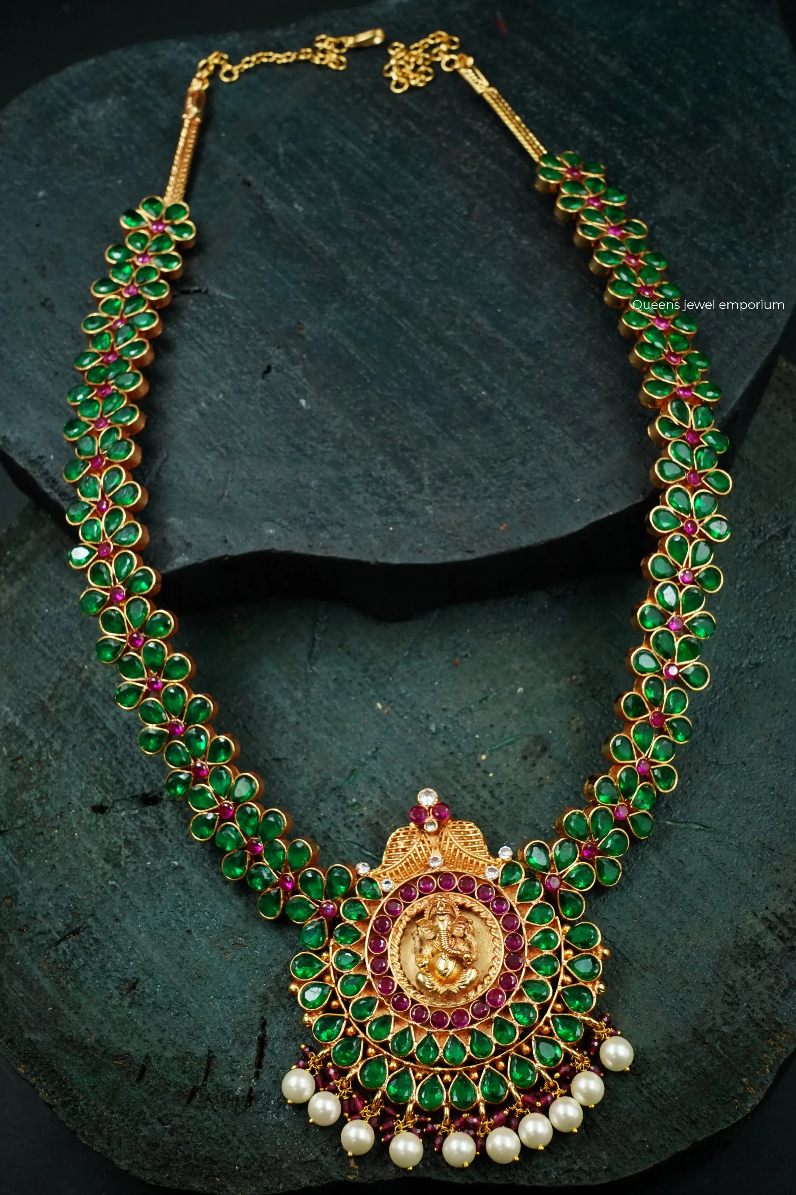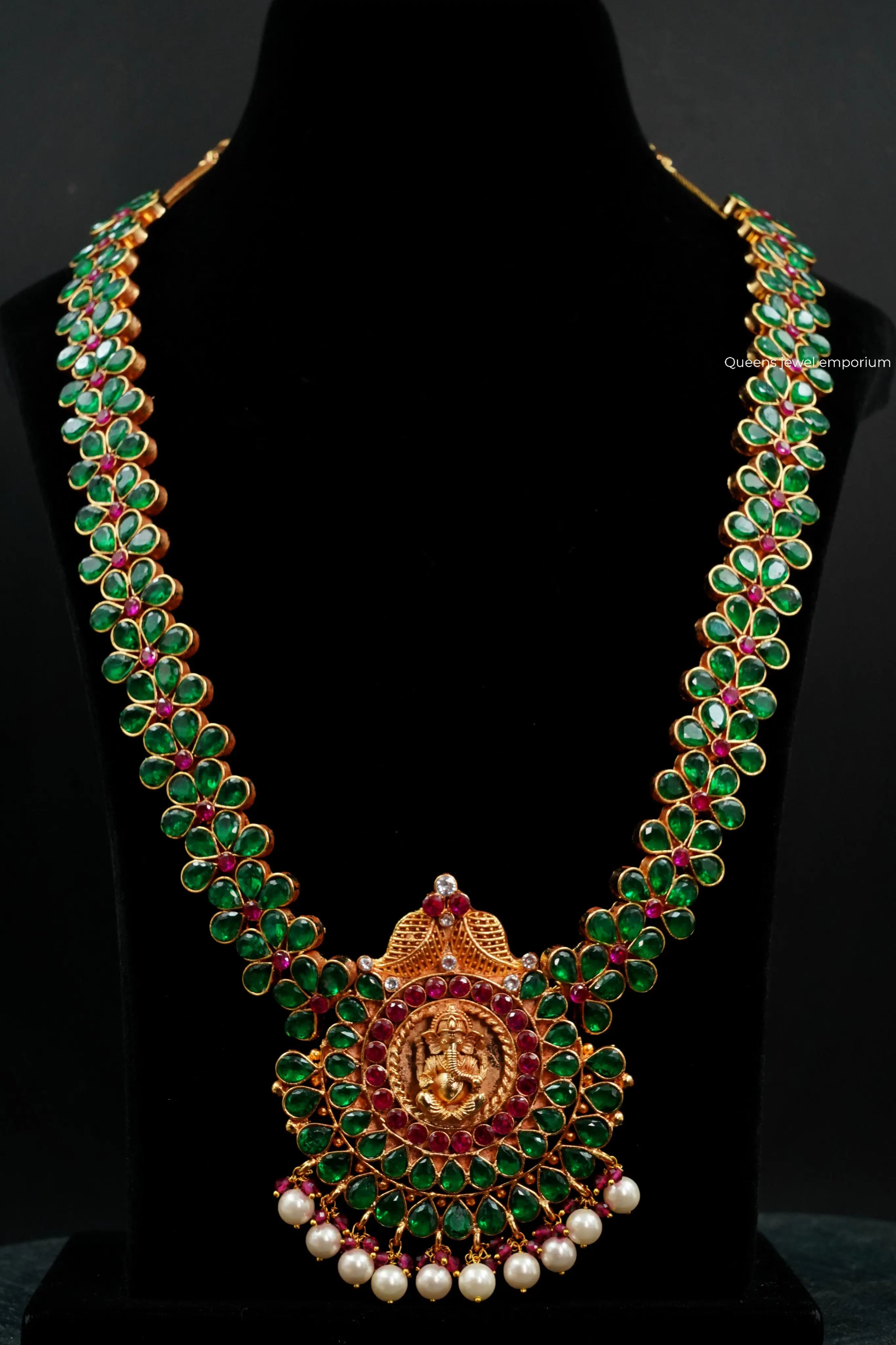 Enhance your traditional attire with our Vinayaka Long Haram from our Temple Collection. Adorned with intricate Vinayaka motifs and a bold zircon stone Naga pendant, experience the beauty and regality of the Chola dynasty. Elevate your style with this elegant piece.
