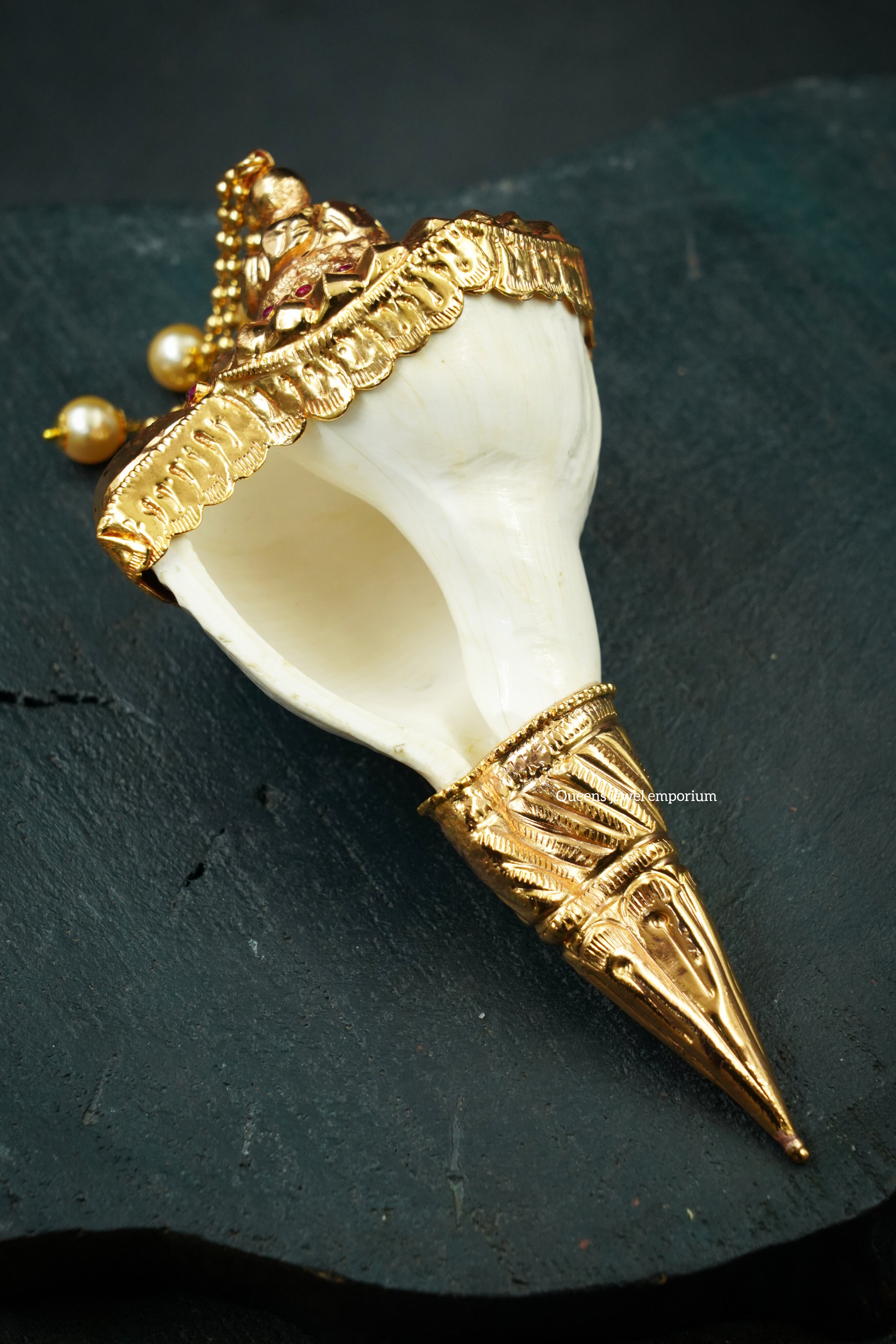 This Vishnu Sangu is a sacred symbol of purity and divine energy. Perfect for placing in pooja rooms, offices, cash lockers, or showcases, it also makes a thoughtful gift for housewarmings, birthdays, marriages, anniversaries, and Diwali celebrations. Truly a timeless spiritual treasure, handcrafted by our expert artisans at Queens Jewel Emporium.
