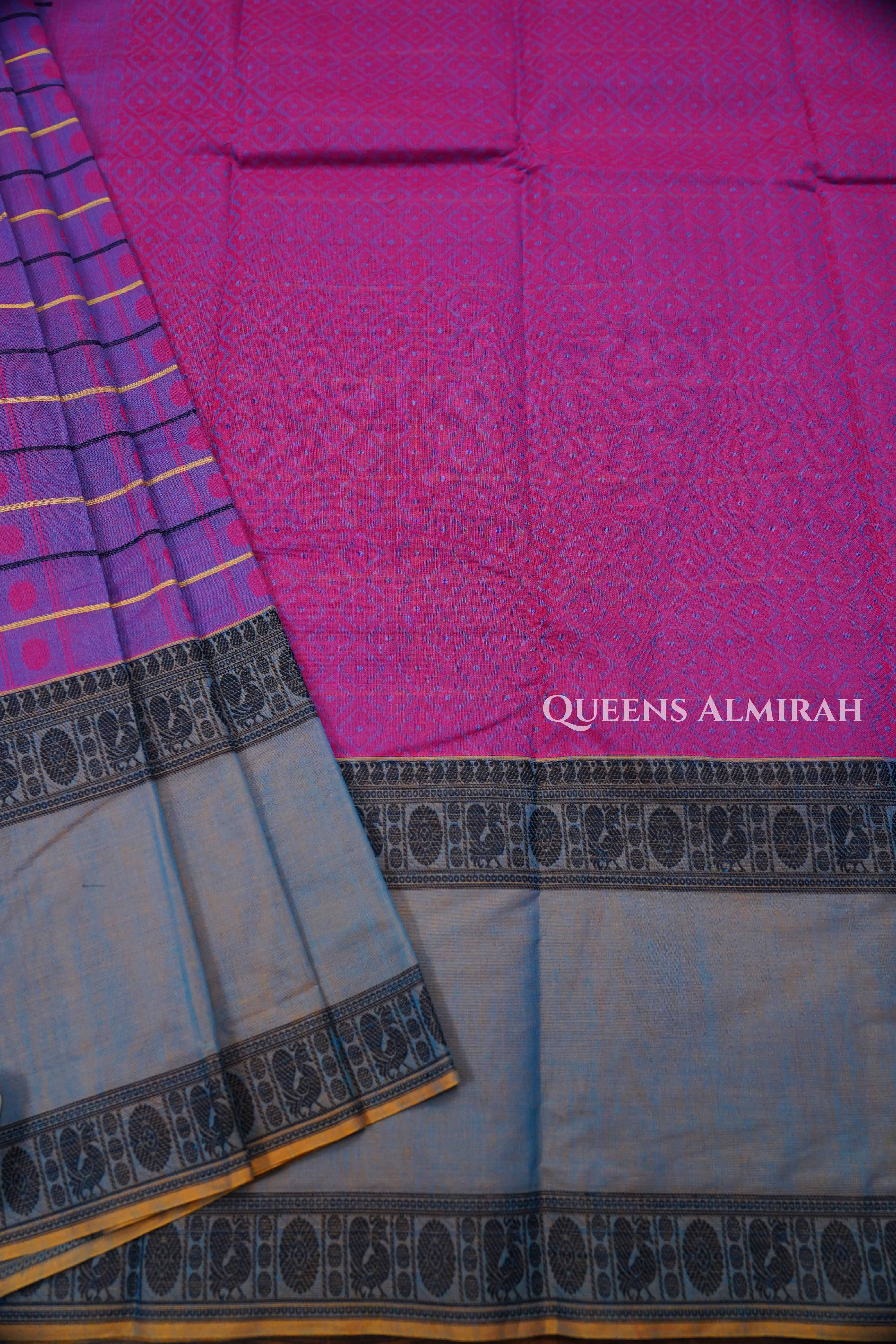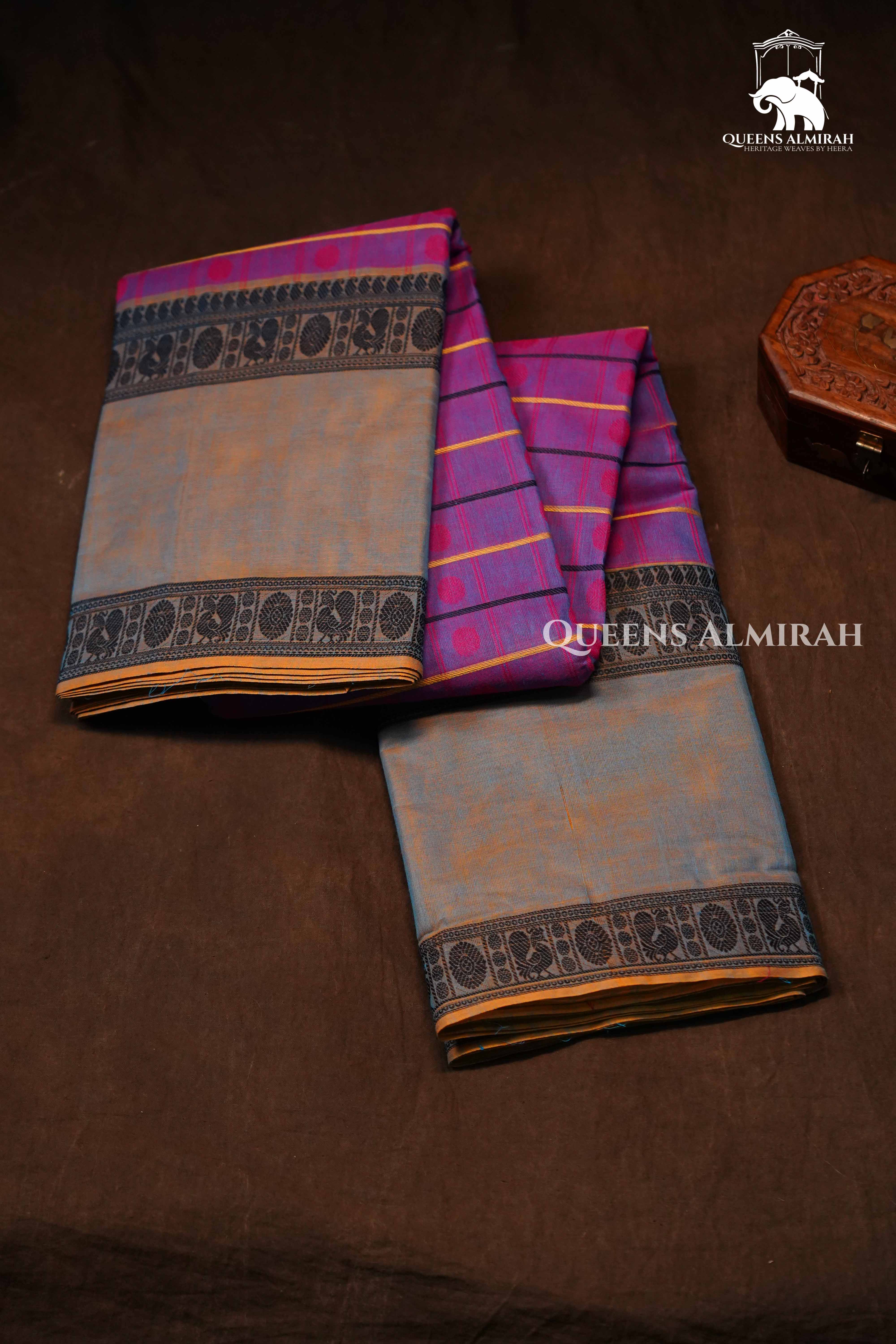 This Chettinad cotton saree comes in a graceful dusky blue body highlighted with elegant coin butta motifs woven in self-design, adding a touch of subtle sophistication. The rich dark pink border featuring traditional temple patterns creates a striking contrast, reflecting the charm of South Indian weaving heritage. Crafted from pure cotton, this saree is lightweight, breathable, and perfect for all-day comfort, making it an ideal choice for festive occasions, cultural events, and everyday elegance.