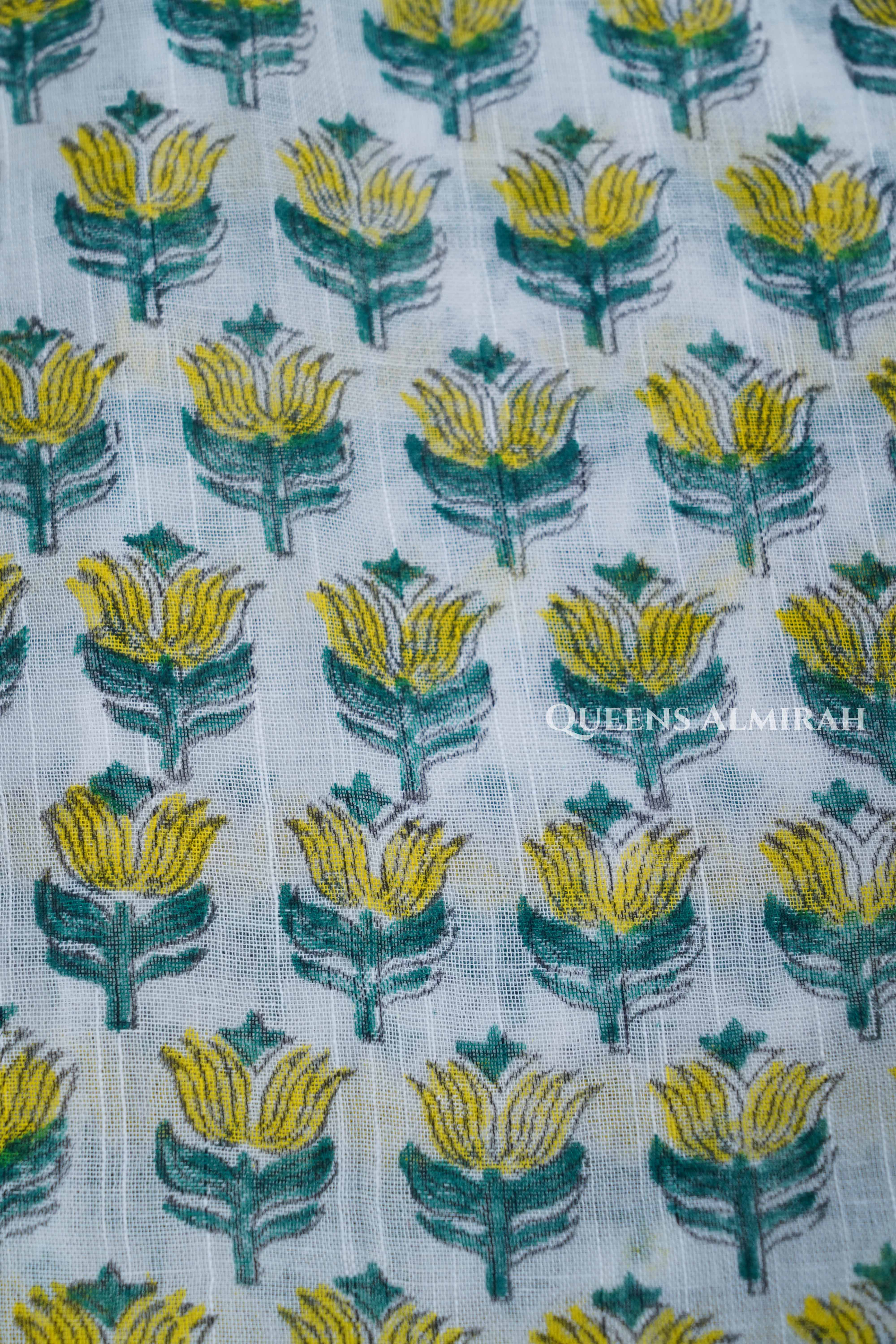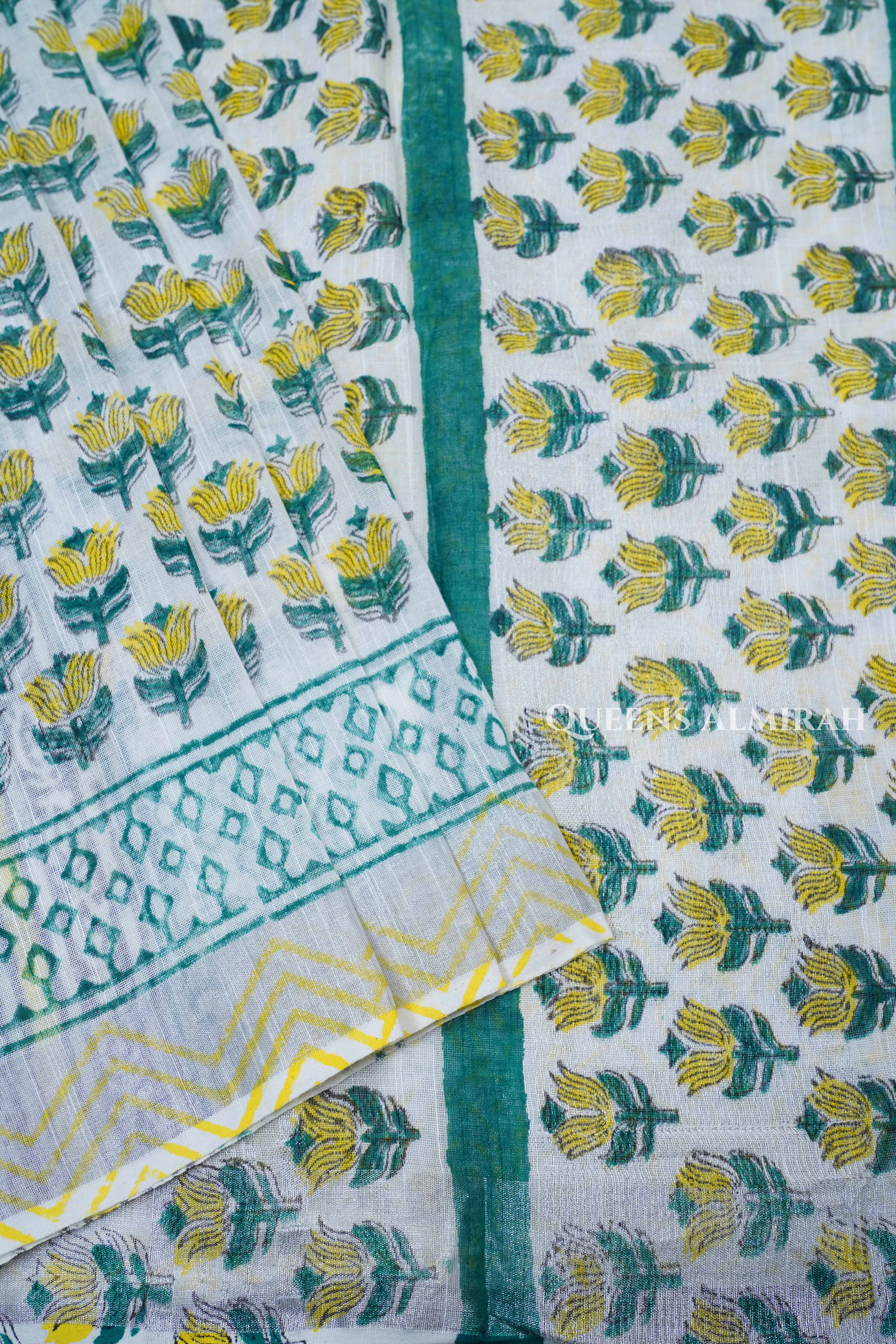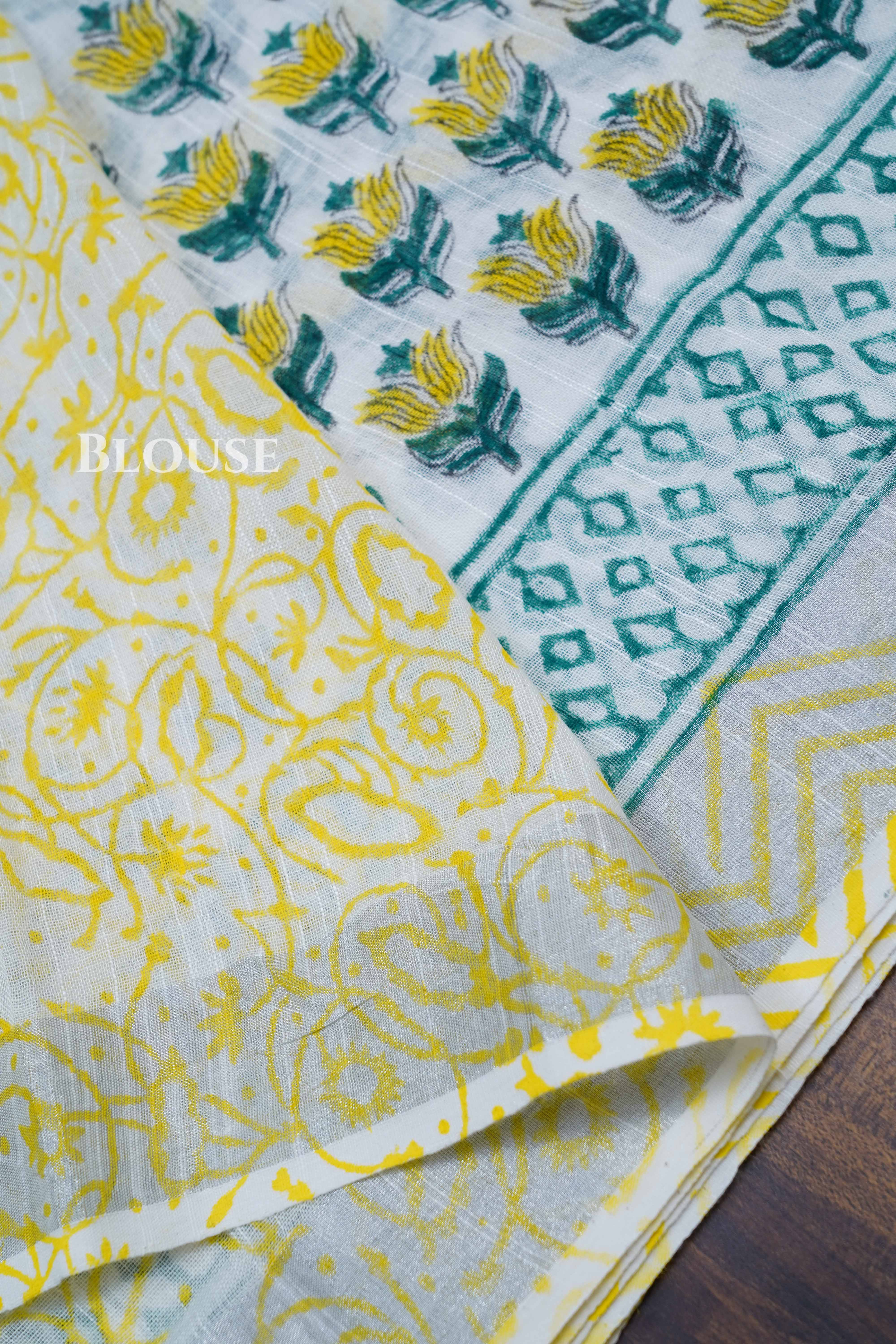 Elegant Linen Cotton Saree featuring beautiful yellow floral block prints with green accents. This lightweight and breathable saree offers perfect comfort and style for daily wear or summer occasions.