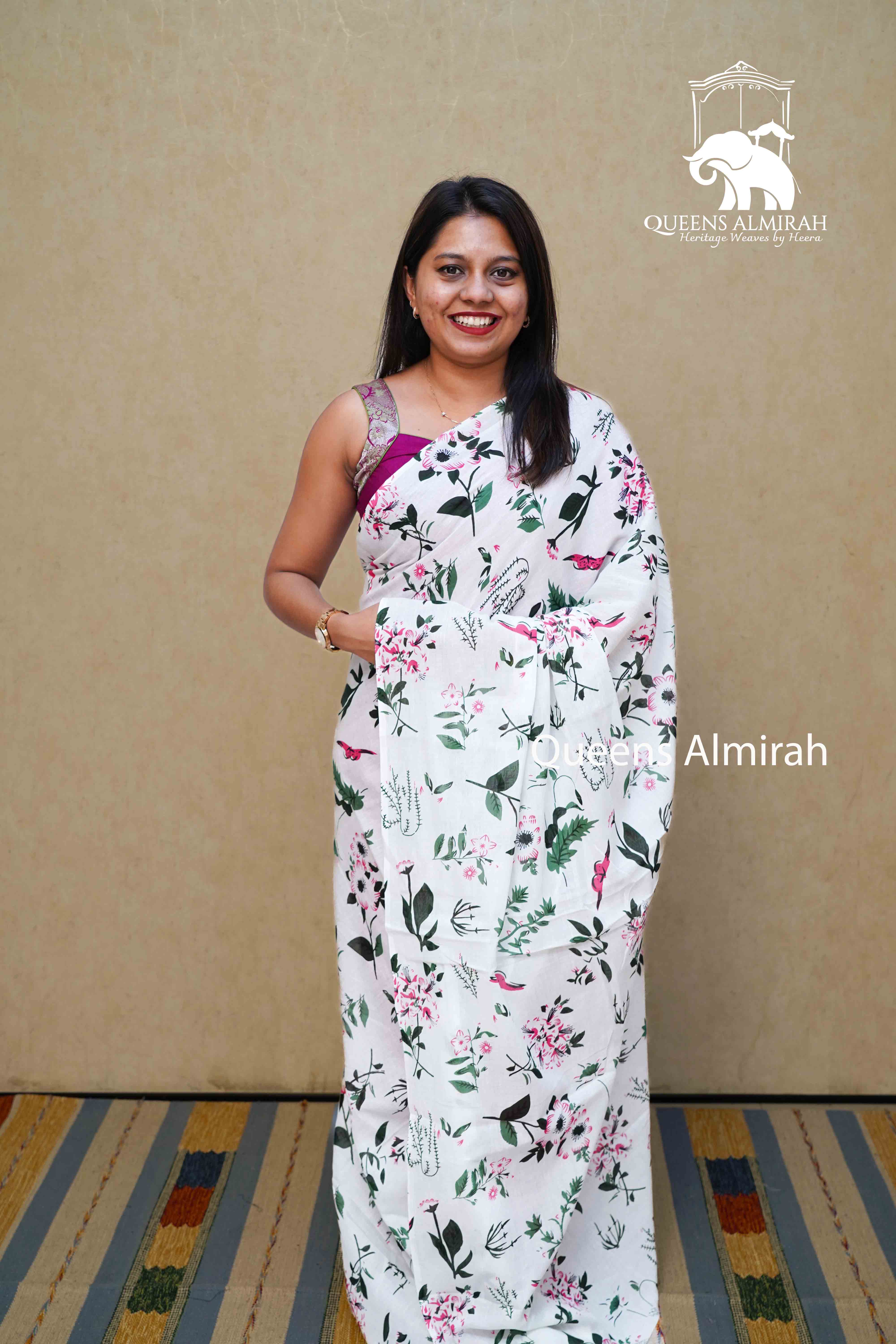 This WHITE MULMUL COTTON SAREE is made from 100% organic pure mulmul cotton, providing exceptional comfort and skin-friendly wear. The floral motif print adds a touch of elegance, making it perfect for everyday wear. Stay cool and stylish with this versatile saree.