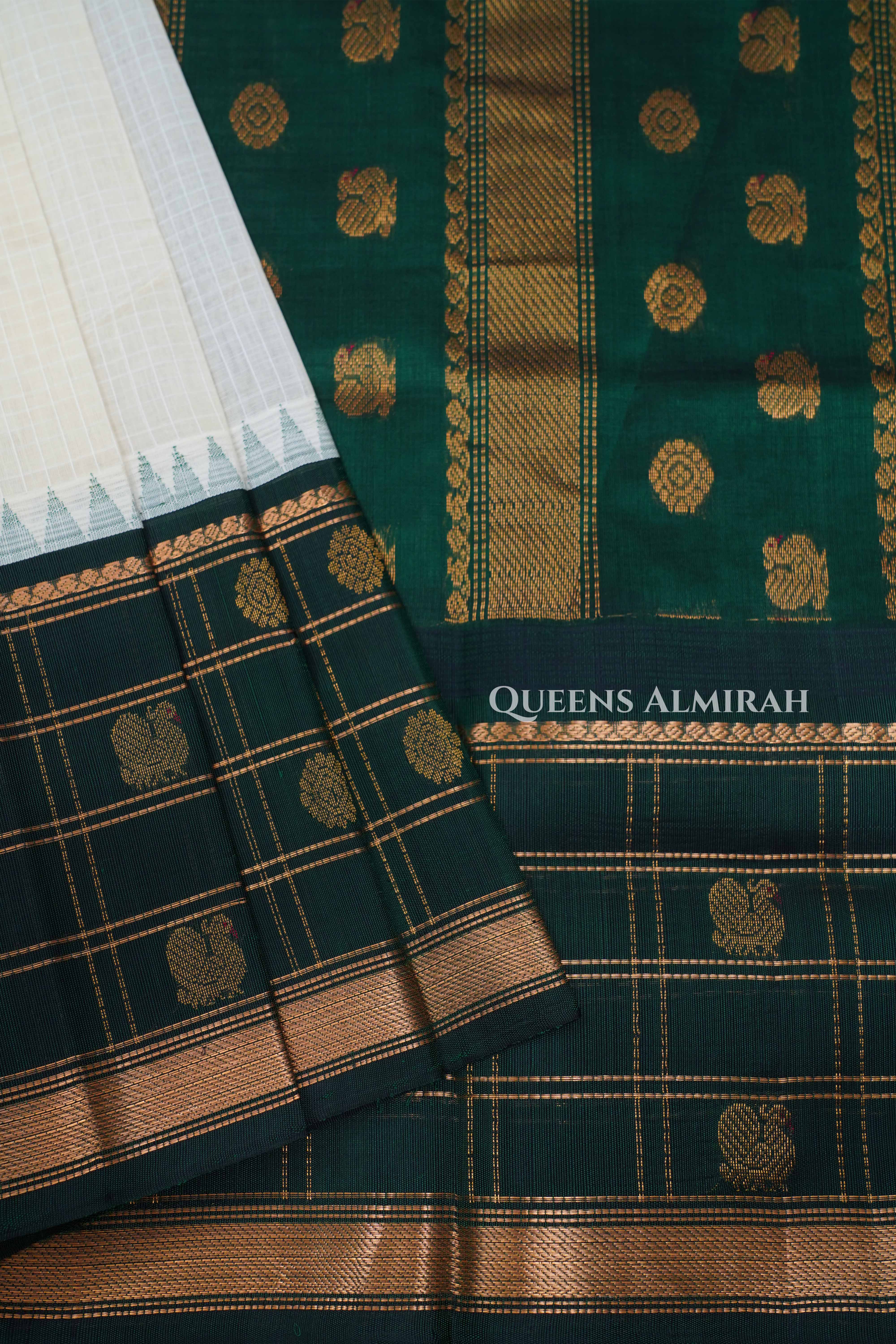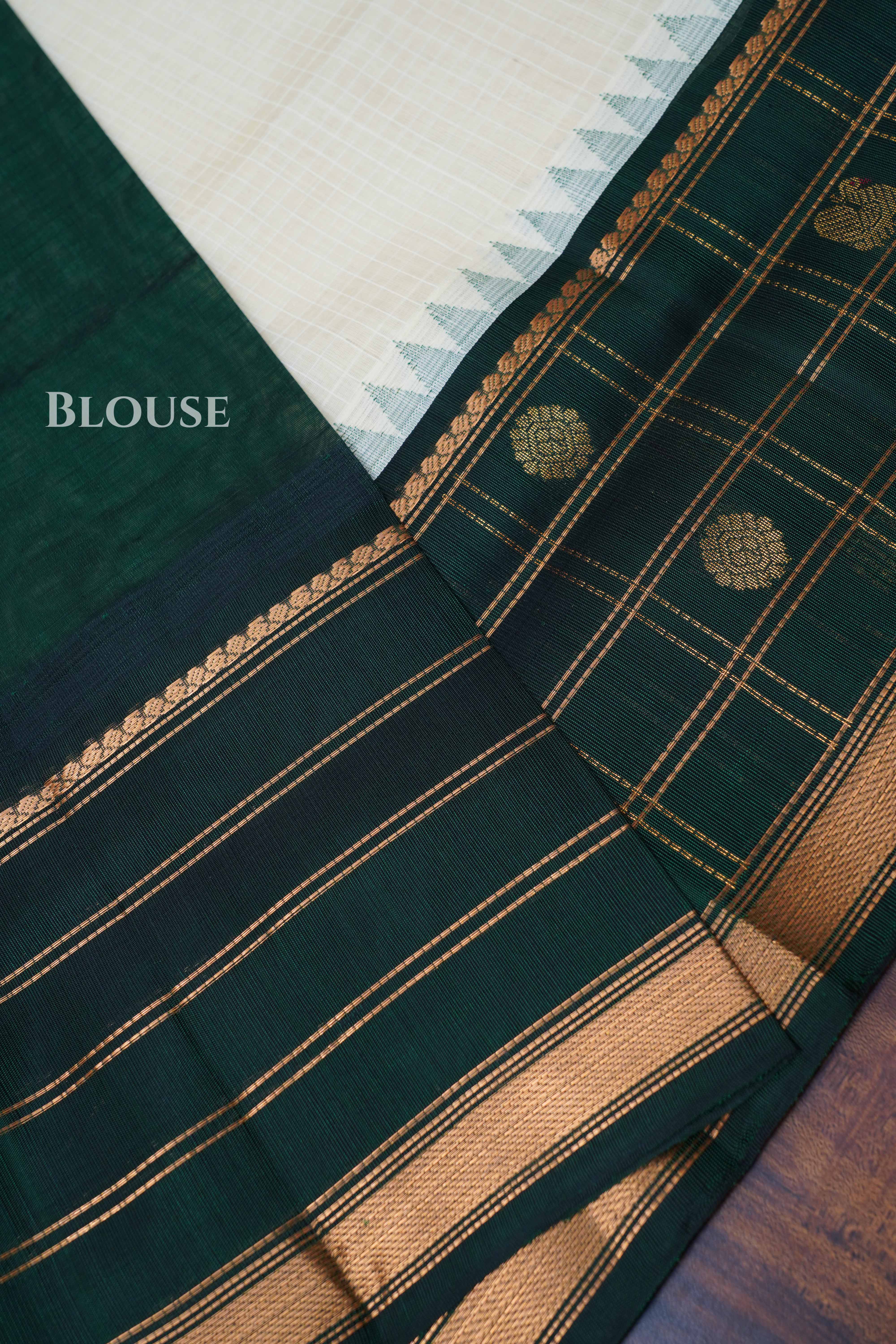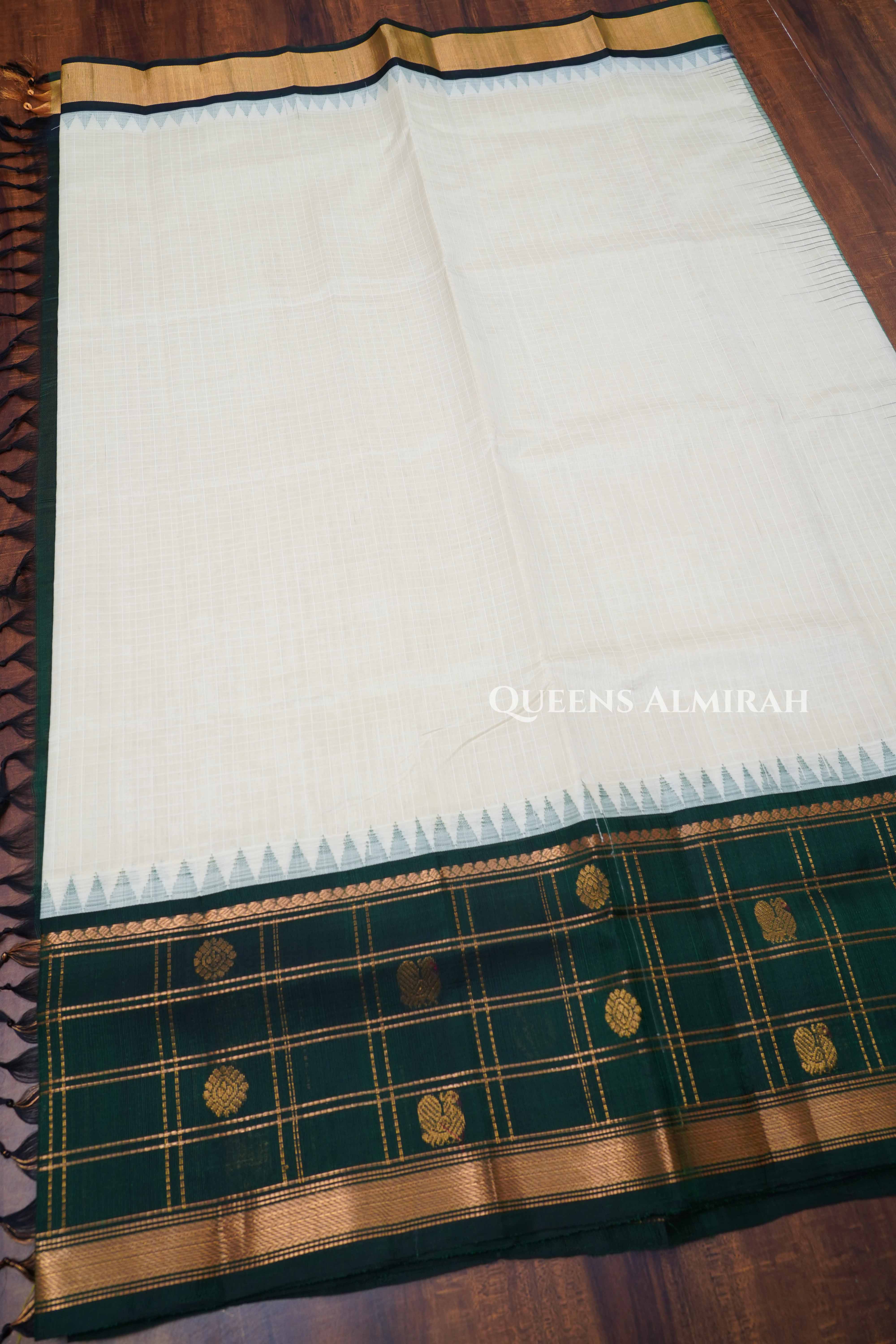 Elegant Kanchi Silk Cotton Saree in soft White and White hues, adorned with rich golden zari stripes. Perfect blend of traditional craftsmanship and modern grace — ideal for festive and special occasions.