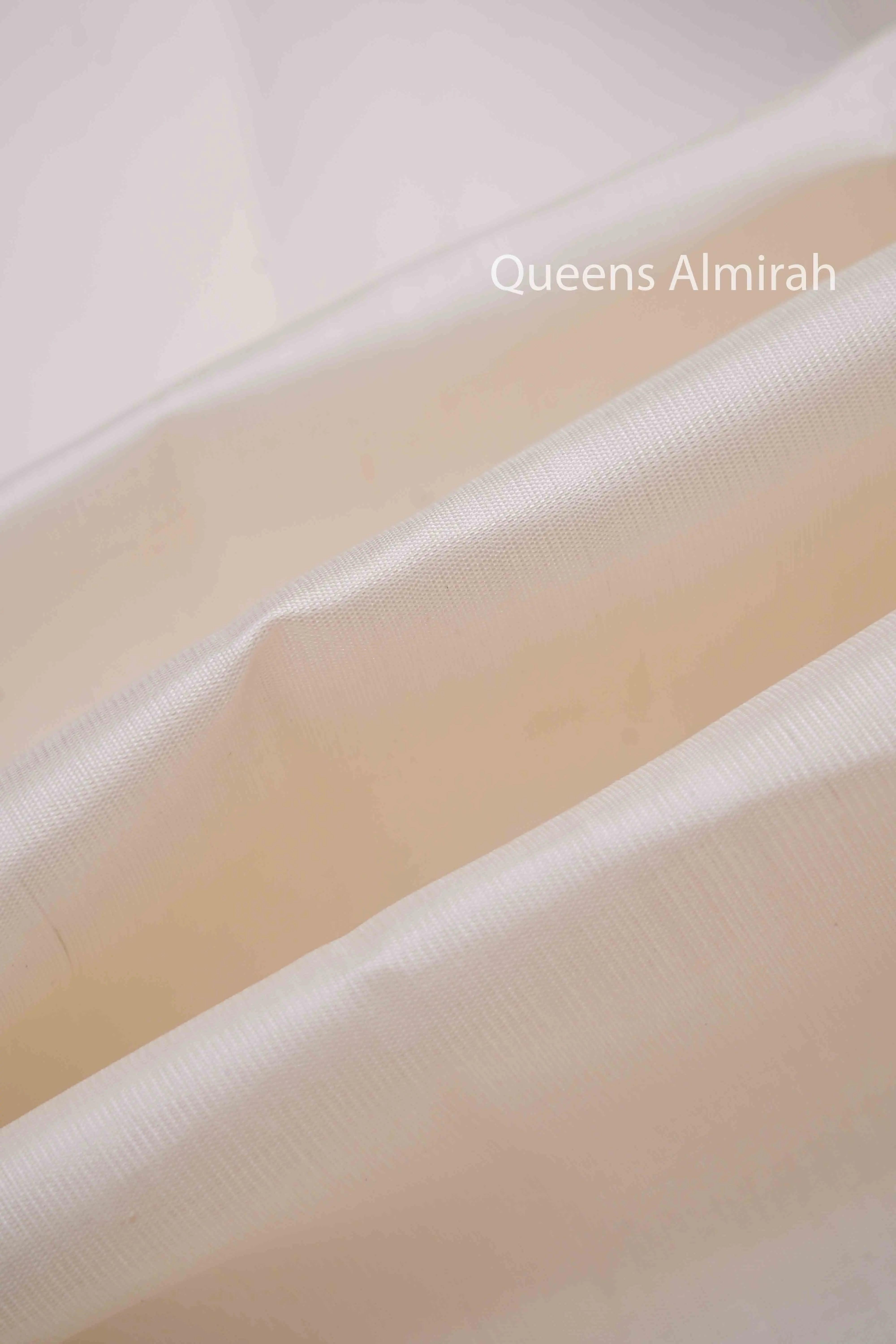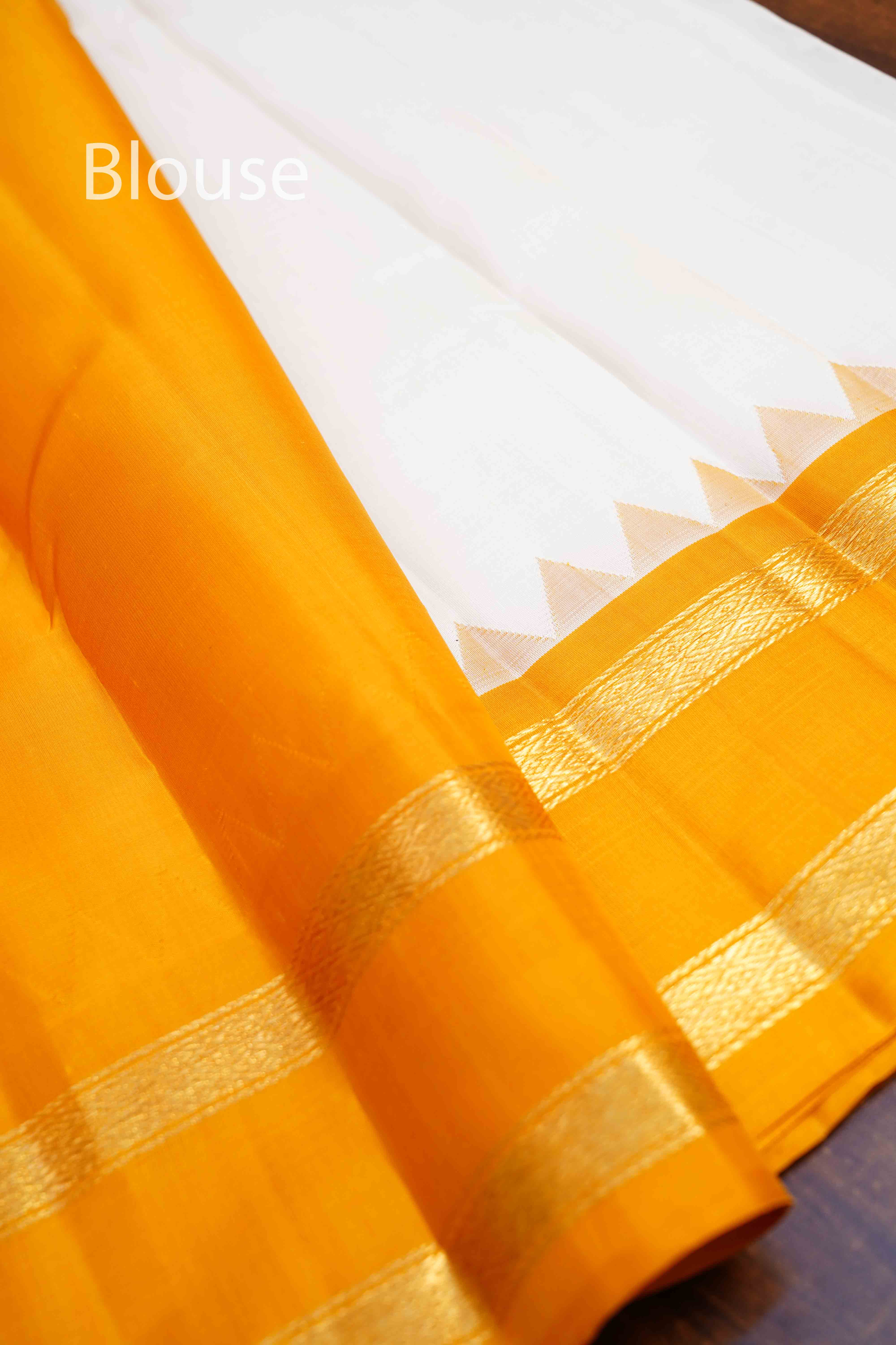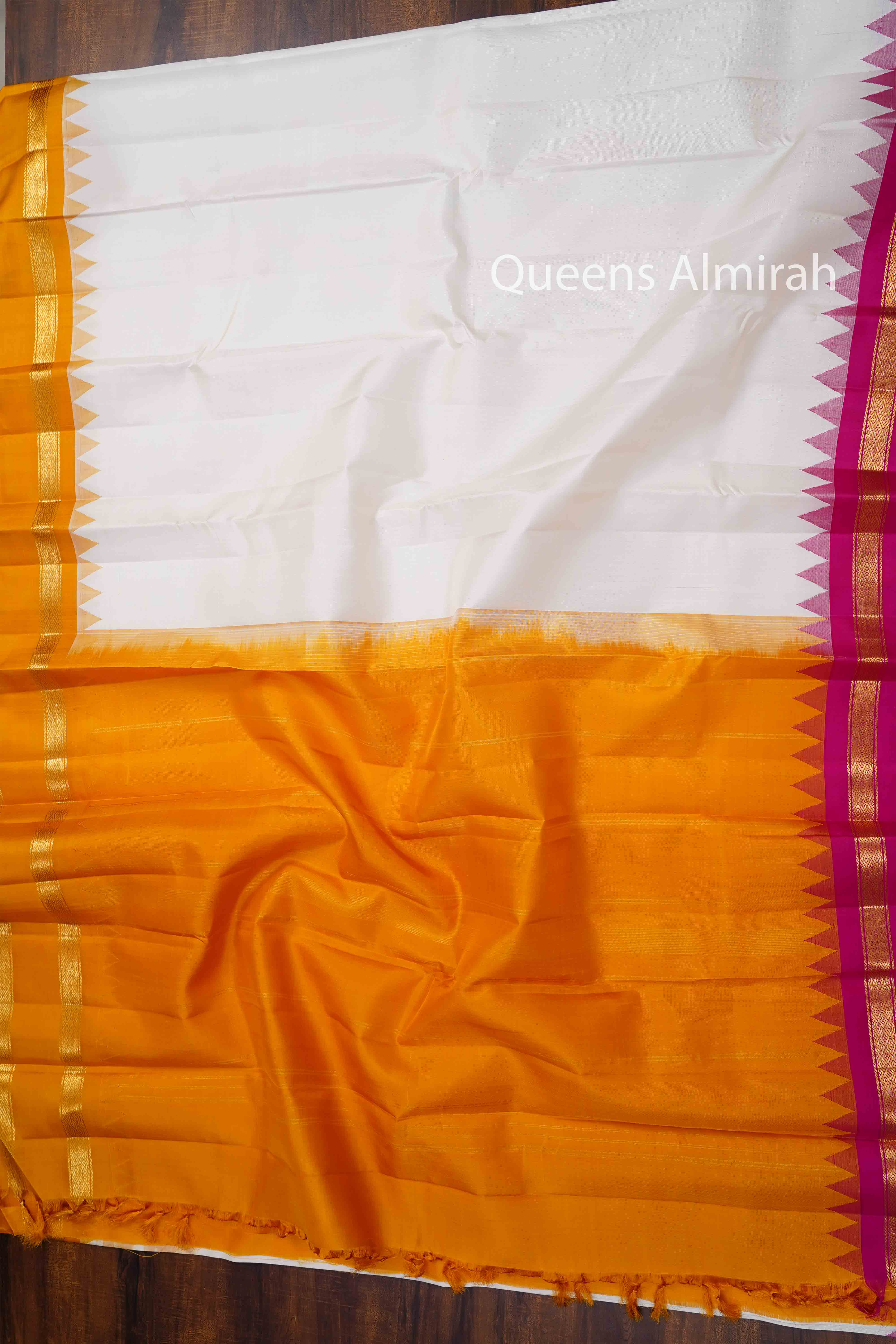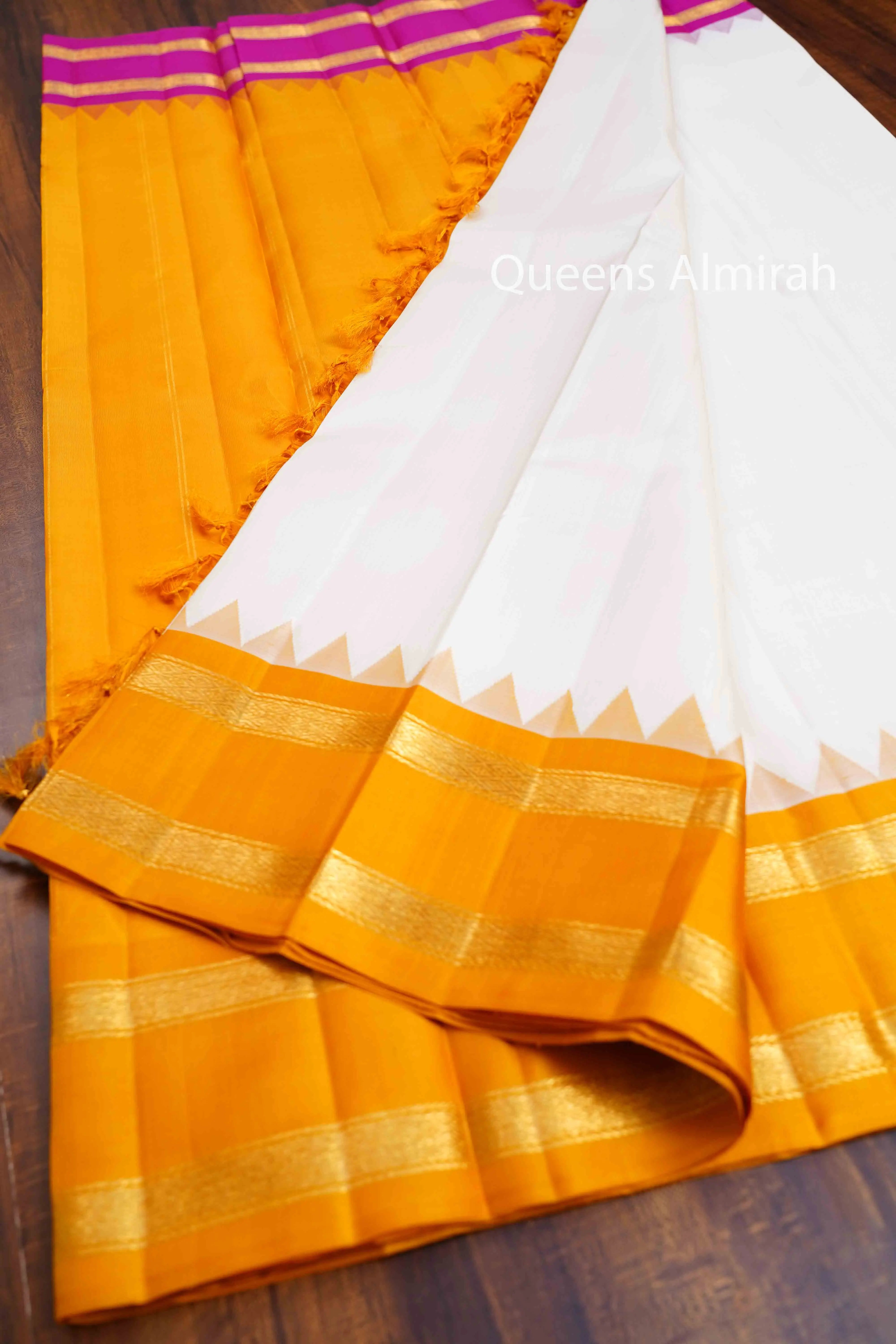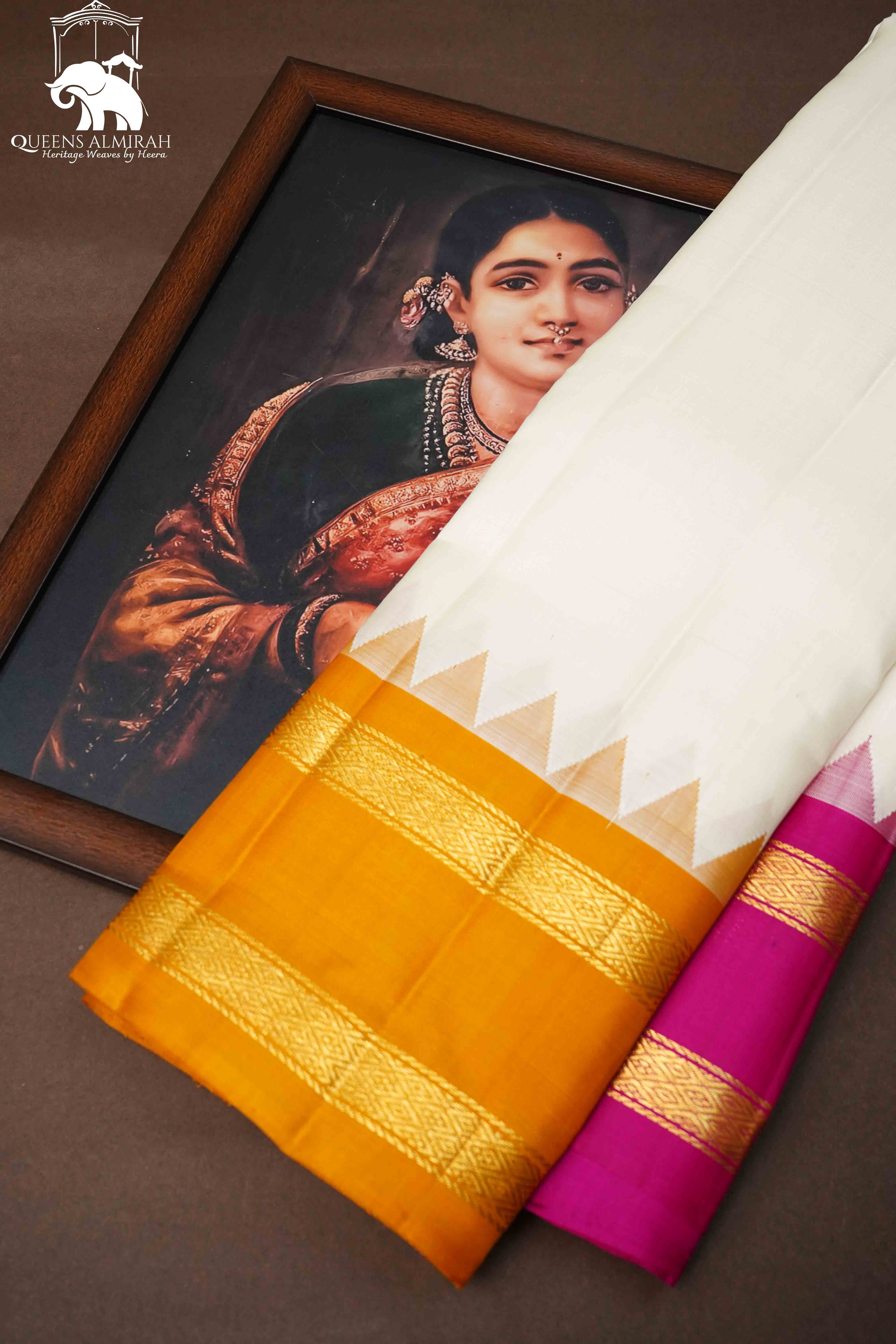 Expertly crafted from pure silk, the WHITE WITH MANGO YELLOW AND JAZZBERRYJAM PINK PURE KANCHIVARAM SILK SAREE showcases a gap golden border in a temple korvai design and a ganga jamuna border for an elegant touch. With luxurious feel and exceptional quality, this saree is sure to elevate any wardrobe.