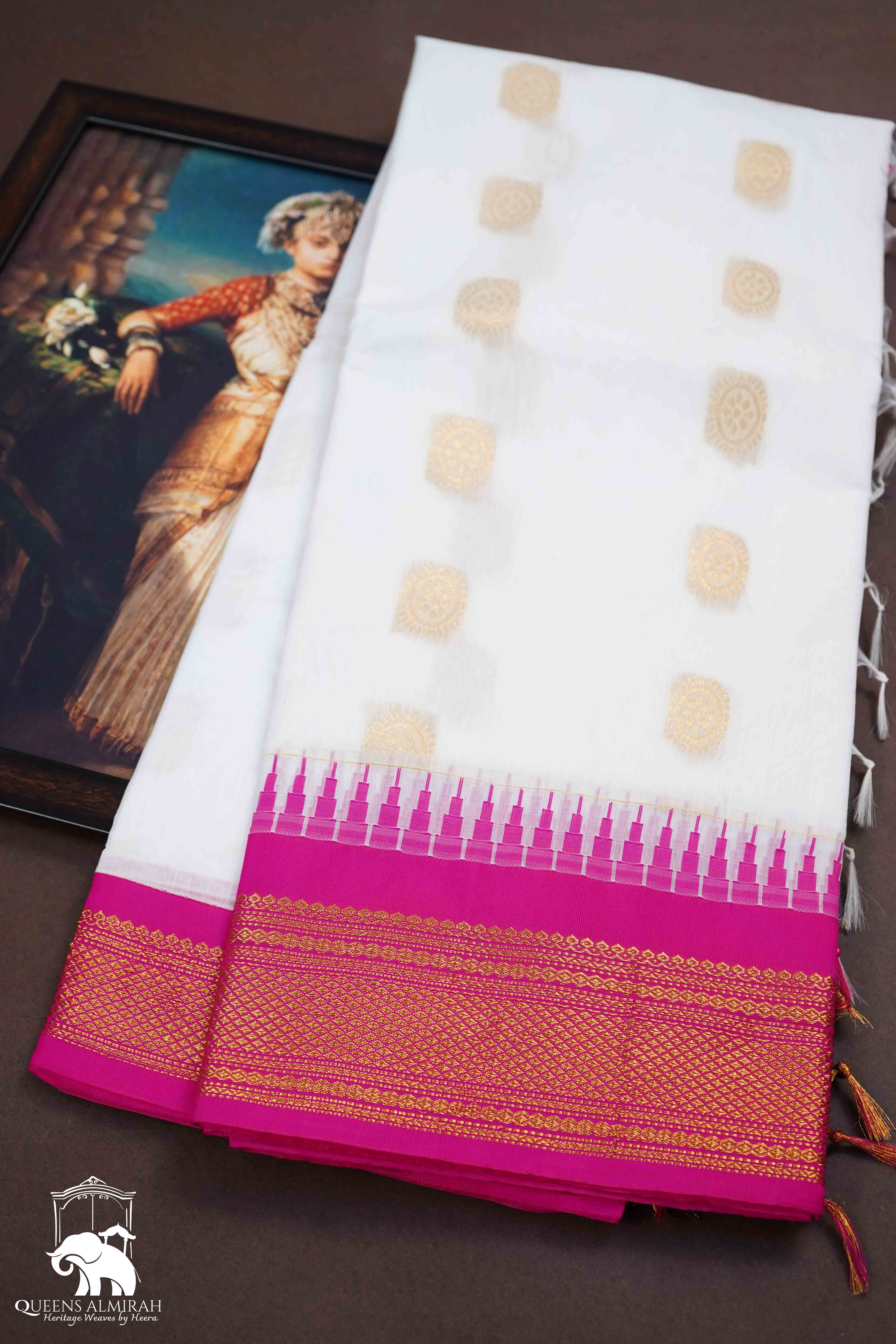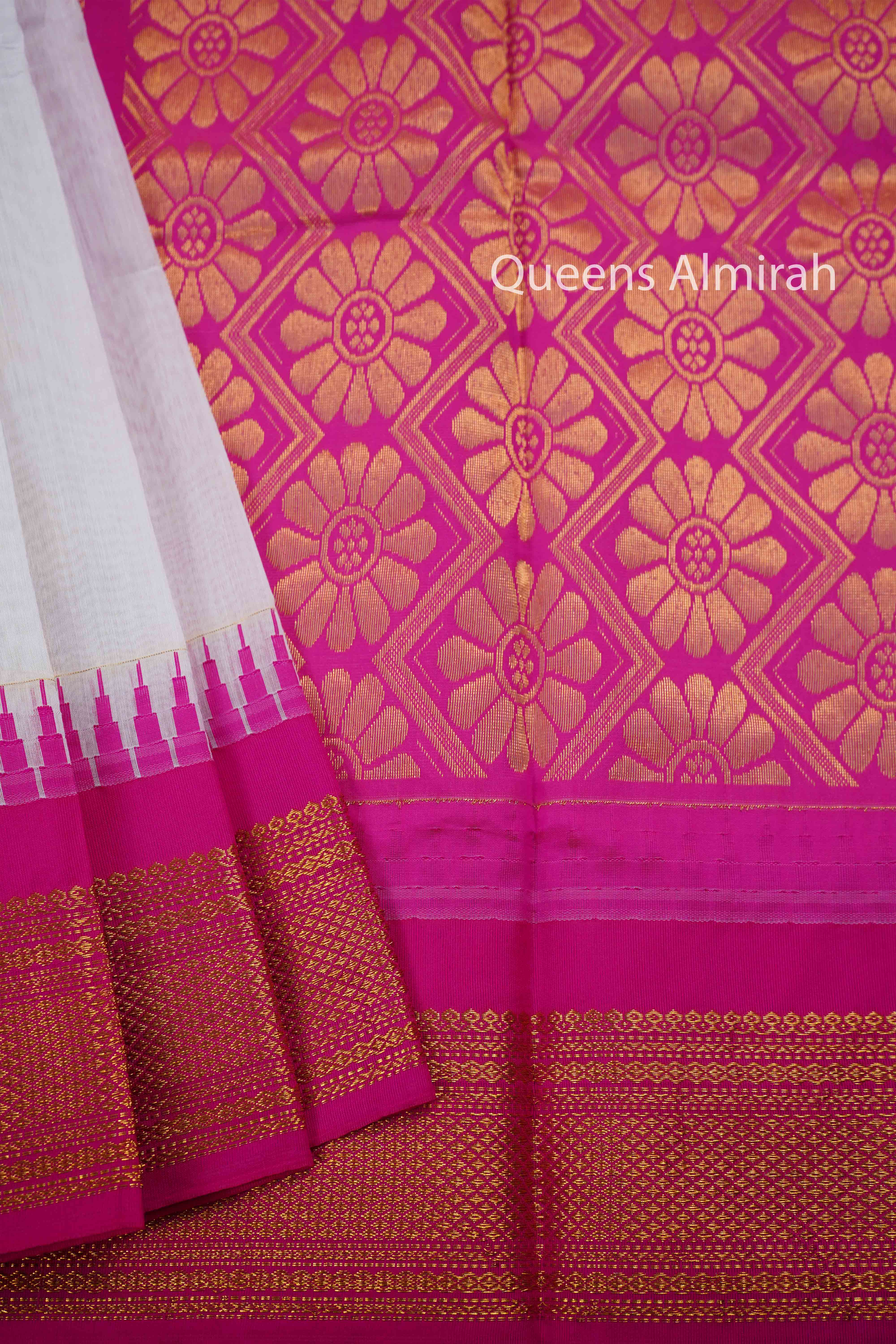 Expertly crafted from pure silk cotton, this white saree with a pink border and temple koravi design exudes luxury. The intricate butta design adds a touch of elegance, making it perfect for any occasion. Experience the comfort and richness of this stunning saree.