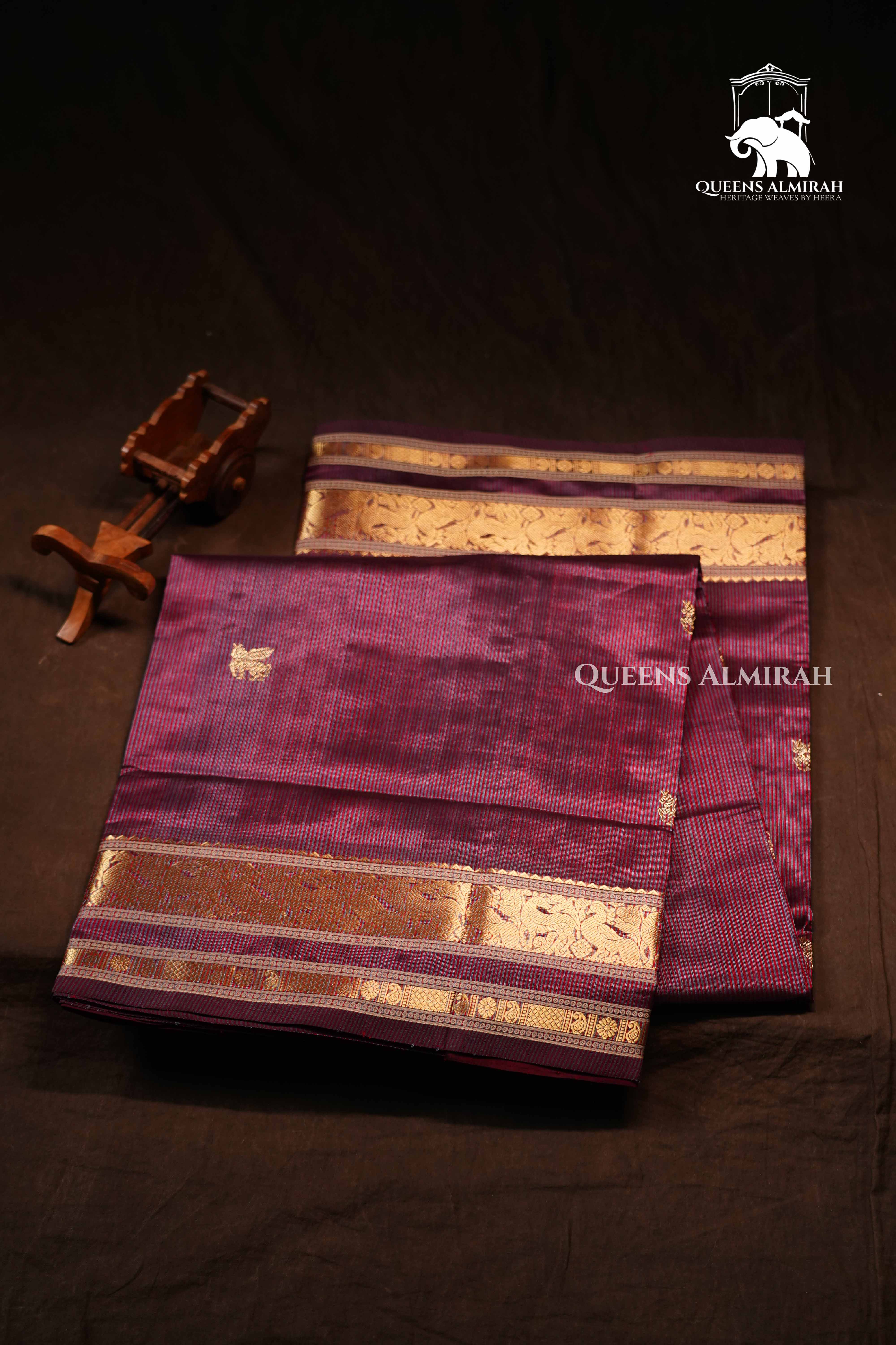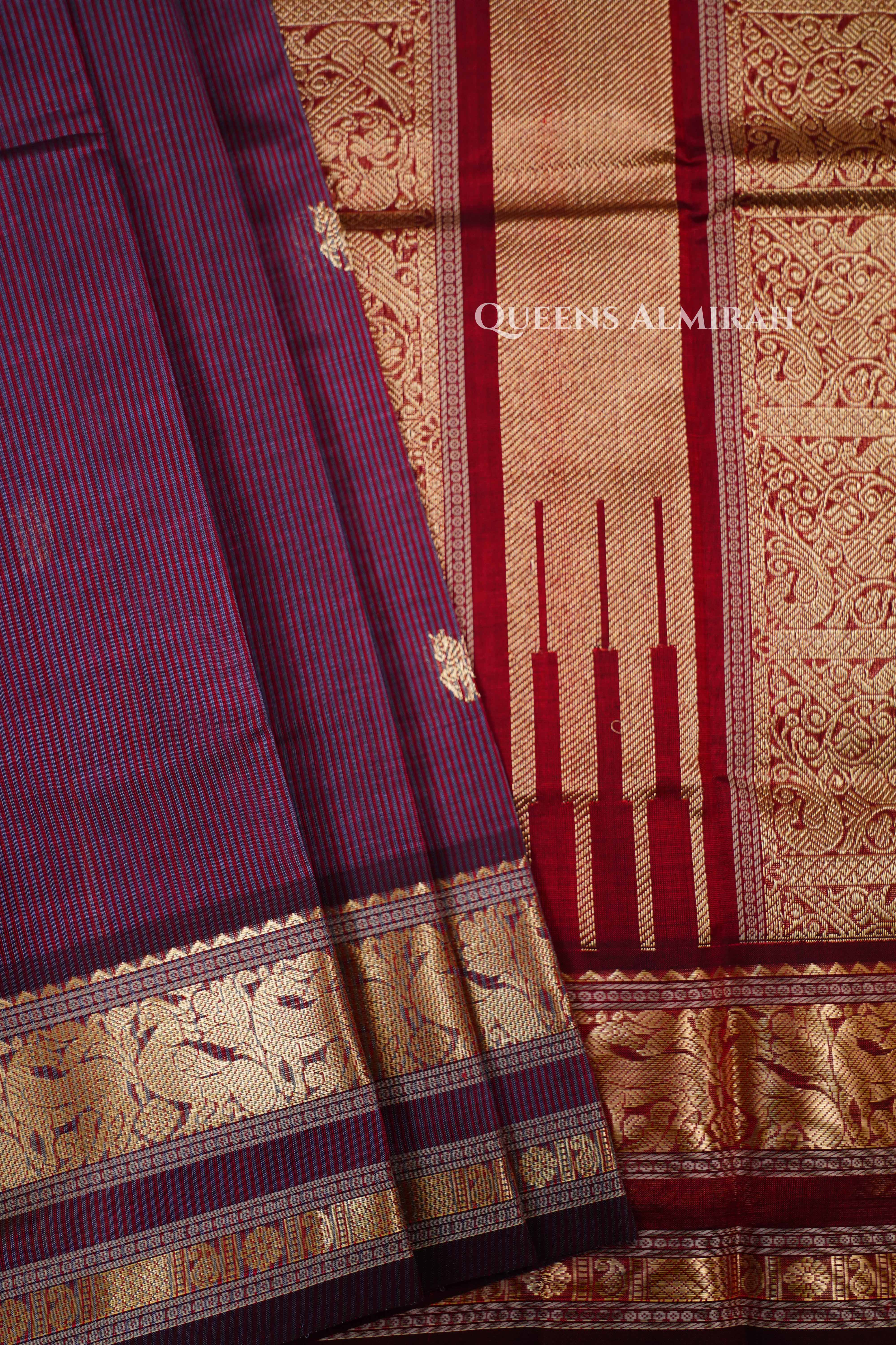“A Wine Berry Chettinad silk cotton saree adorned with subtle pinstripes and an opulent golden zari border featuring intricate floral motifs, exuding traditional grandeur and sophistication.”