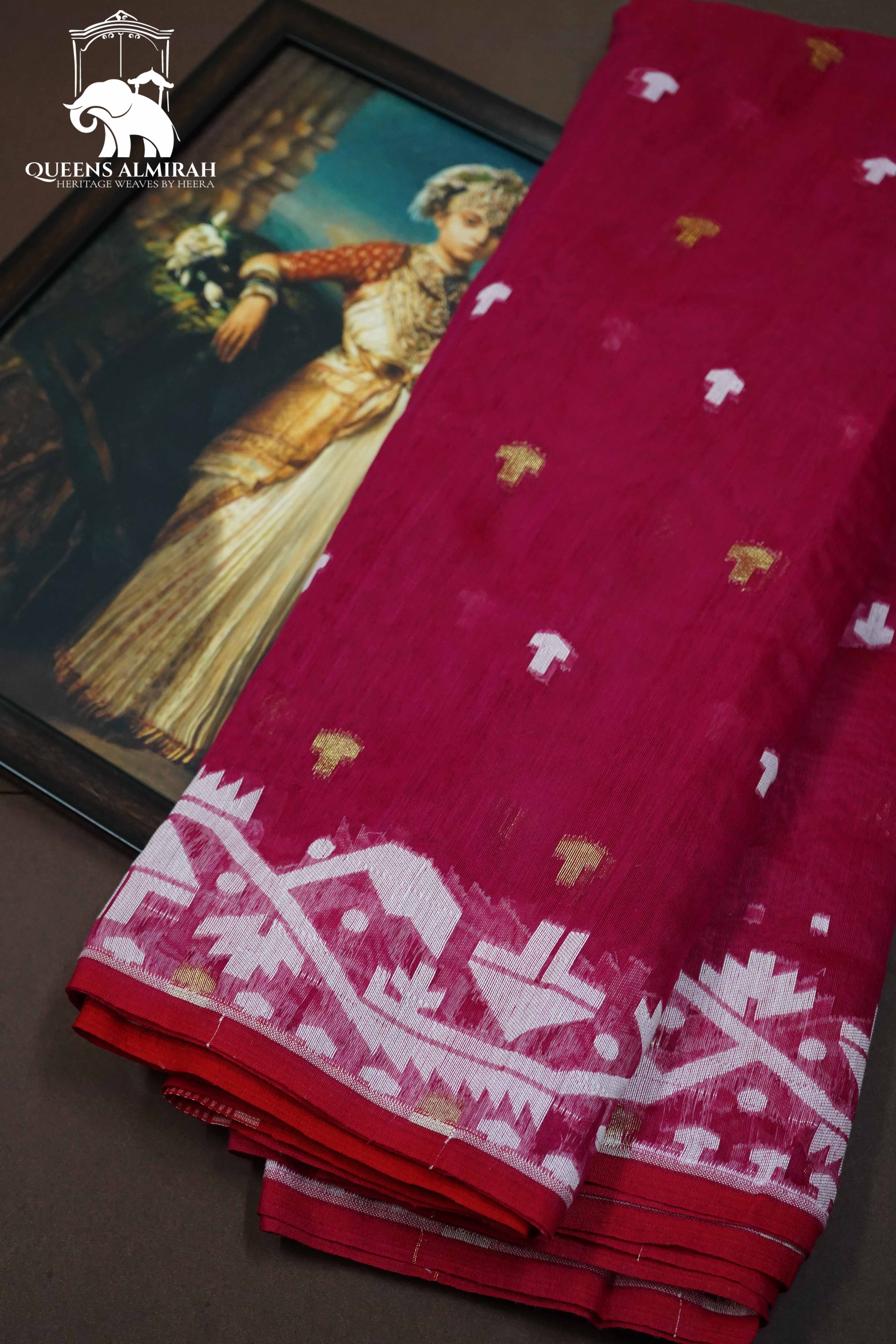 This WINE RED JAMDANI COTTON SAREE offers the perfect blend of softness and ease of wear, making it a versatile and stylish choice for any occasion. Handwoven with intricate Jamdani designs, it adds a touch of elegance to any outfit. Crafted with high-quality cotton, it guarantees both comfort and durability. Perfect for any weather.