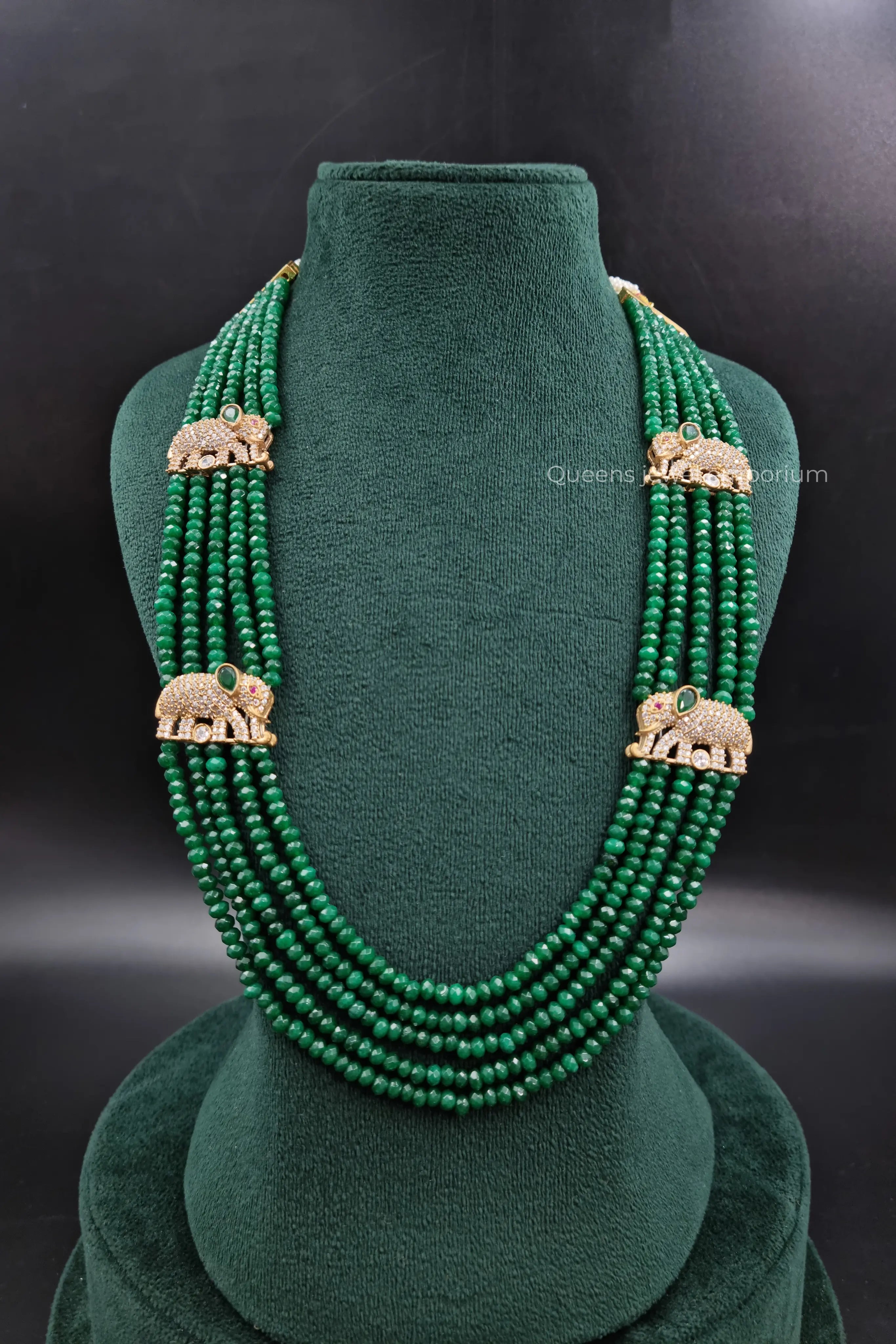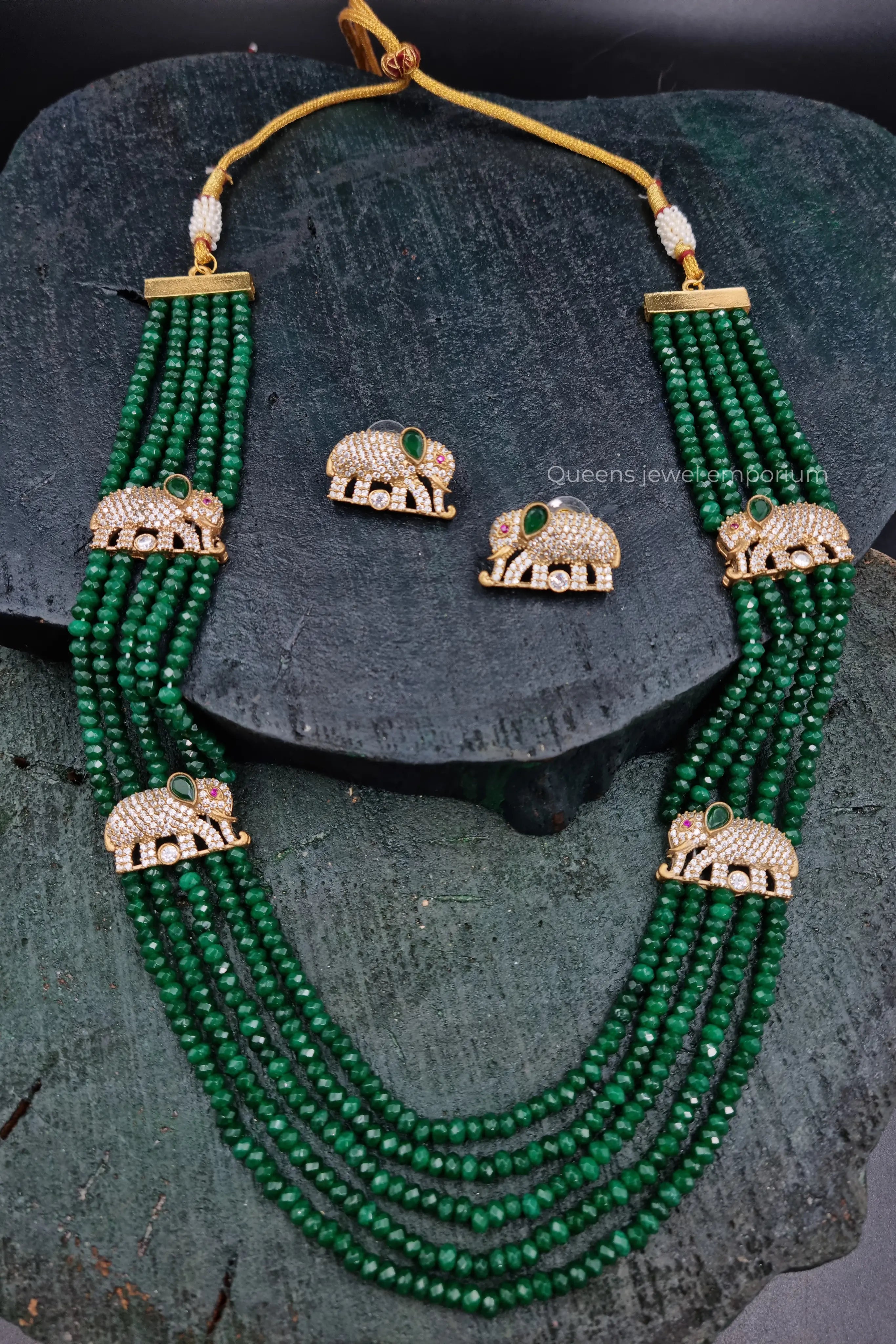 This YASHWANTHI HARAM is a premium quality piece adorned with green and maroon beads, white zircon stones, and elephant motifs for a stunning Victorian set. Expertly crafted, this haram offers a unique blend of elegance and matching earrings, perfect for any occasion. Own a piece of expertly-crafted jewelry that will elevate your style.