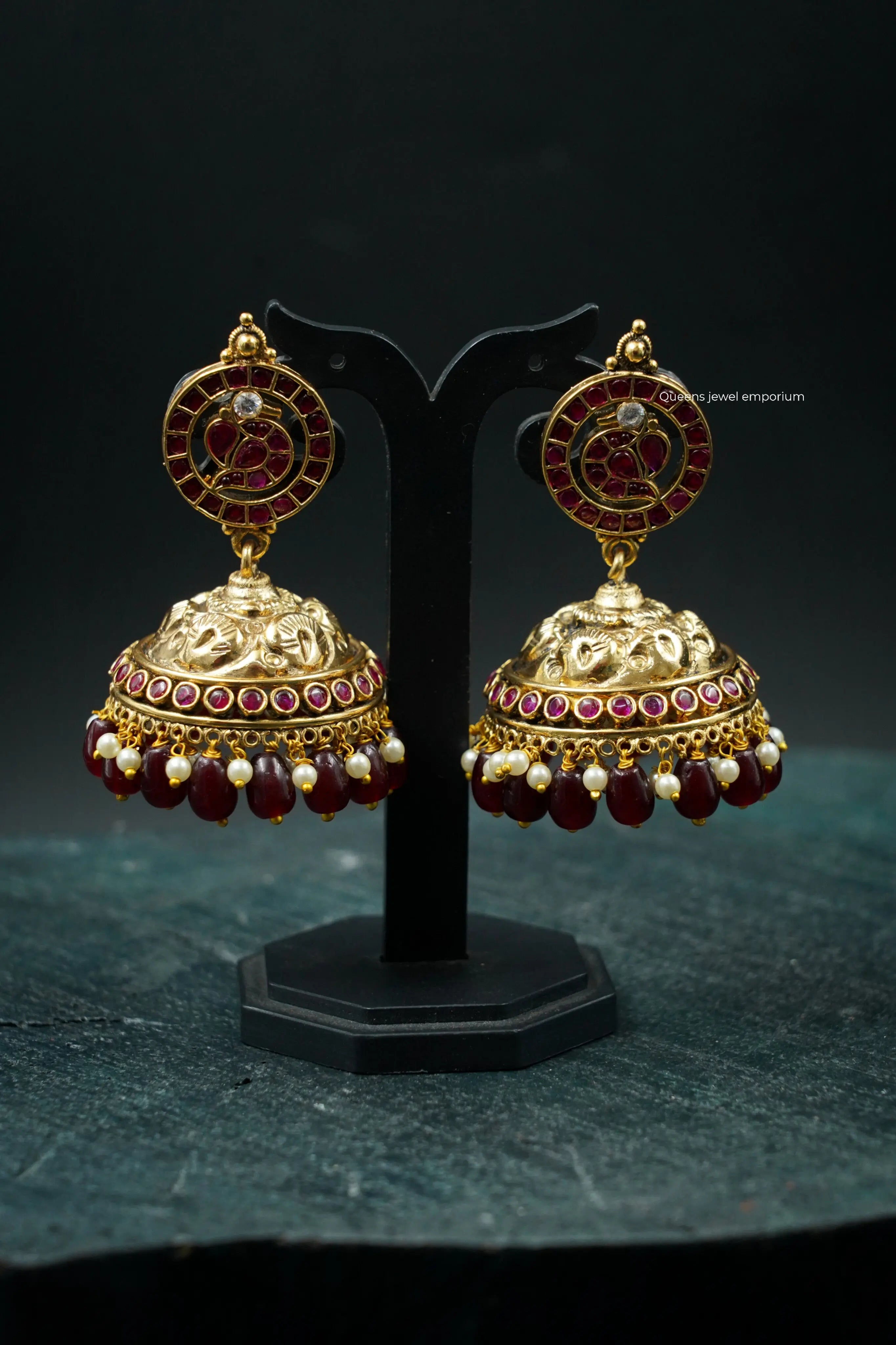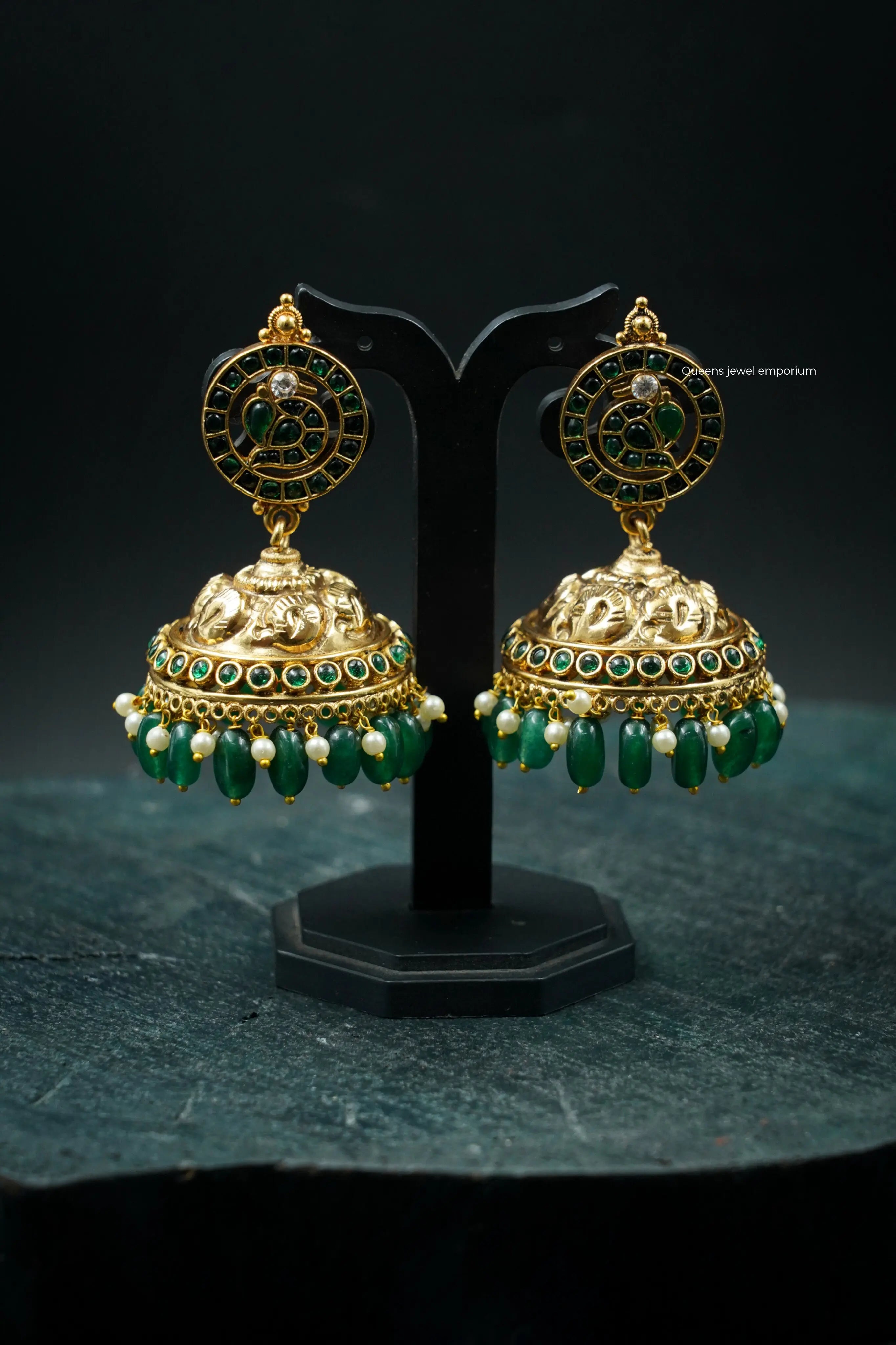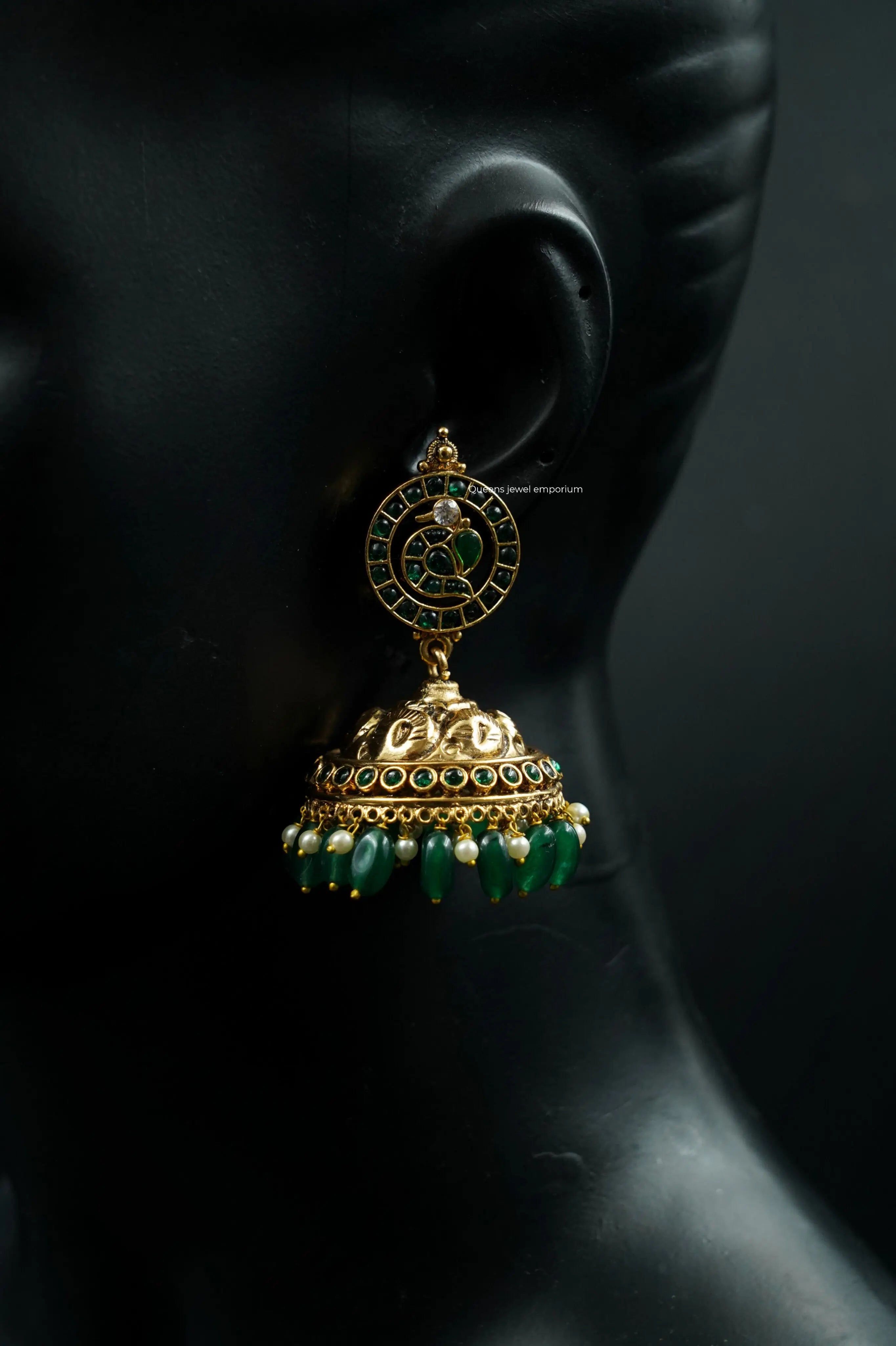 Elevate your style with our Big Jhumka, featuring an Annapatchi Motif and adorned with beads and pearls. Perfect for weddings and traditional functions, these jhumkas add a touch of elegance and heritage to your pattu saree. Stand out with confidence and grace