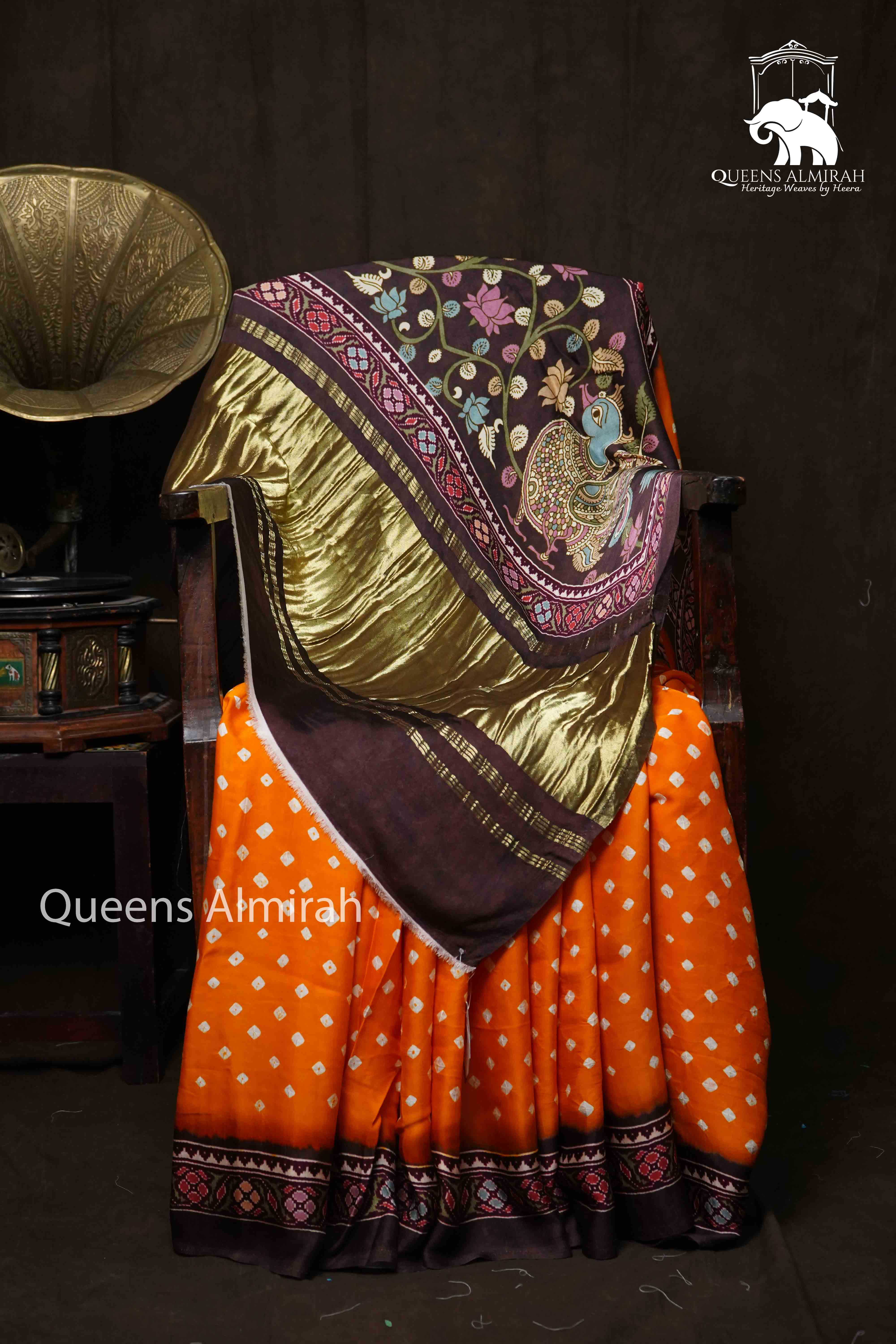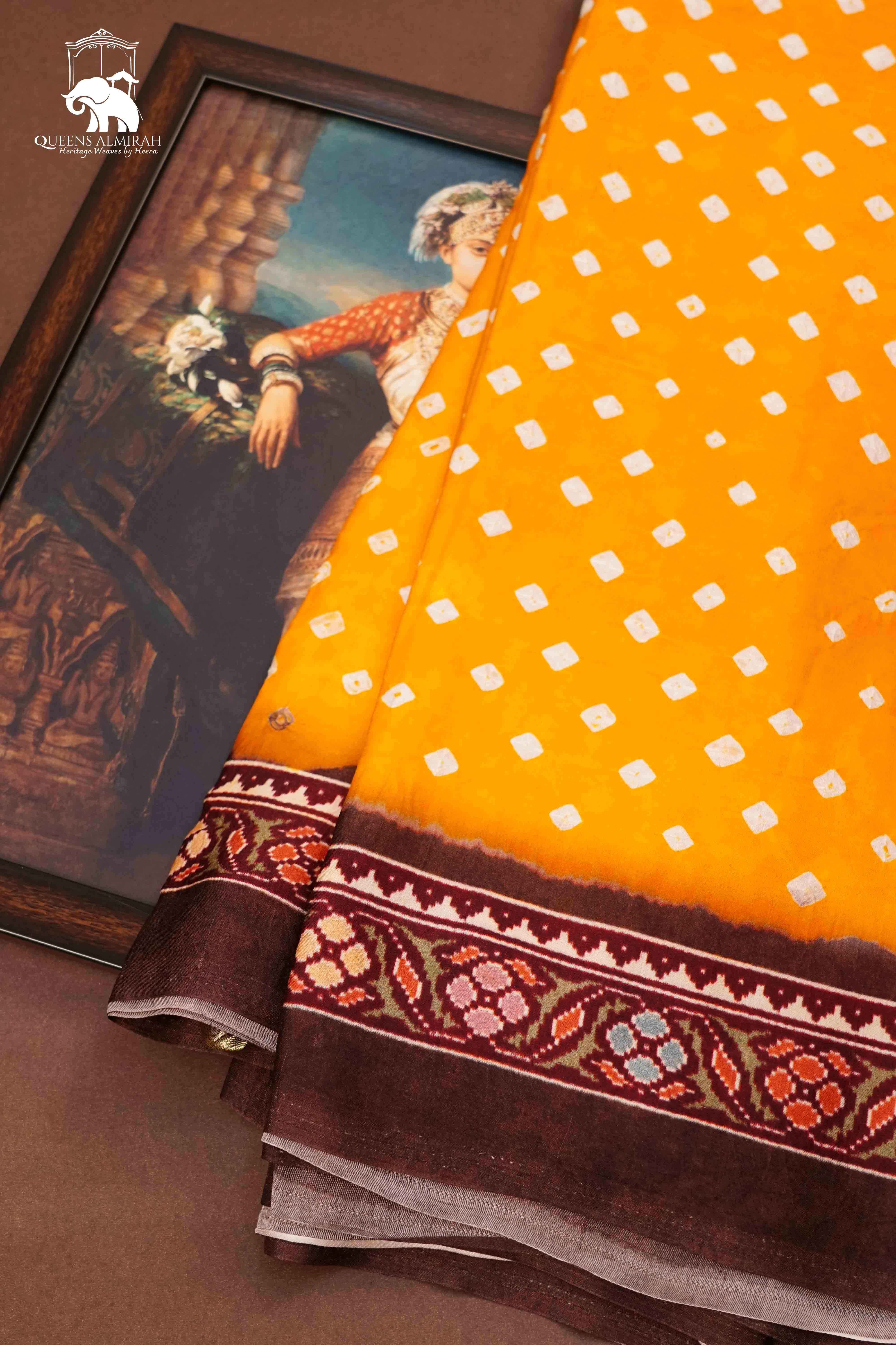 Introducing the perfect fusion of sophistication and comfort - the Yellow Orange With Deep Oak Modal Silk Saree. Featuring a unique AJARGH and PALLU design, this saree is sure to make a statement at any special occasion. Crafted from high-quality modal silk material, it offers both style and comfort for a truly luxurious experience.