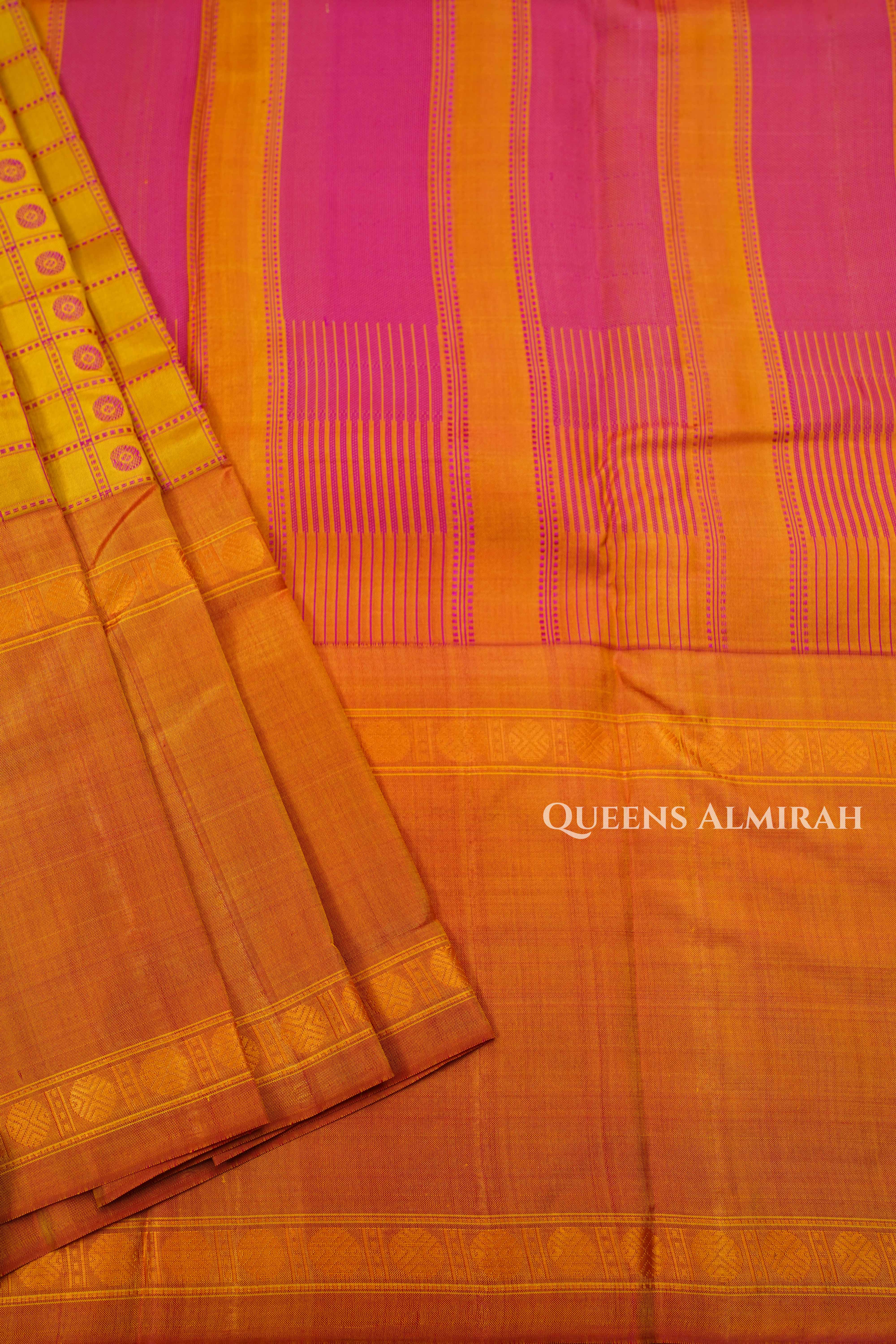 Elevate your ethnic wardrobe with our Yellow With Honey BrownPure Kanchivaram Silk Saree, a true masterpiece of South Indian handloom craftsmanship. Woven from 100% pure silk, this saree features traditional thread work, intricate thousand butta and checks pattern, and rich Rudraksha silk thread detailing.Perfect for weddings, festivals, and special occasions, this Kanchipuram silk saree combines classic style with luxurious texture.