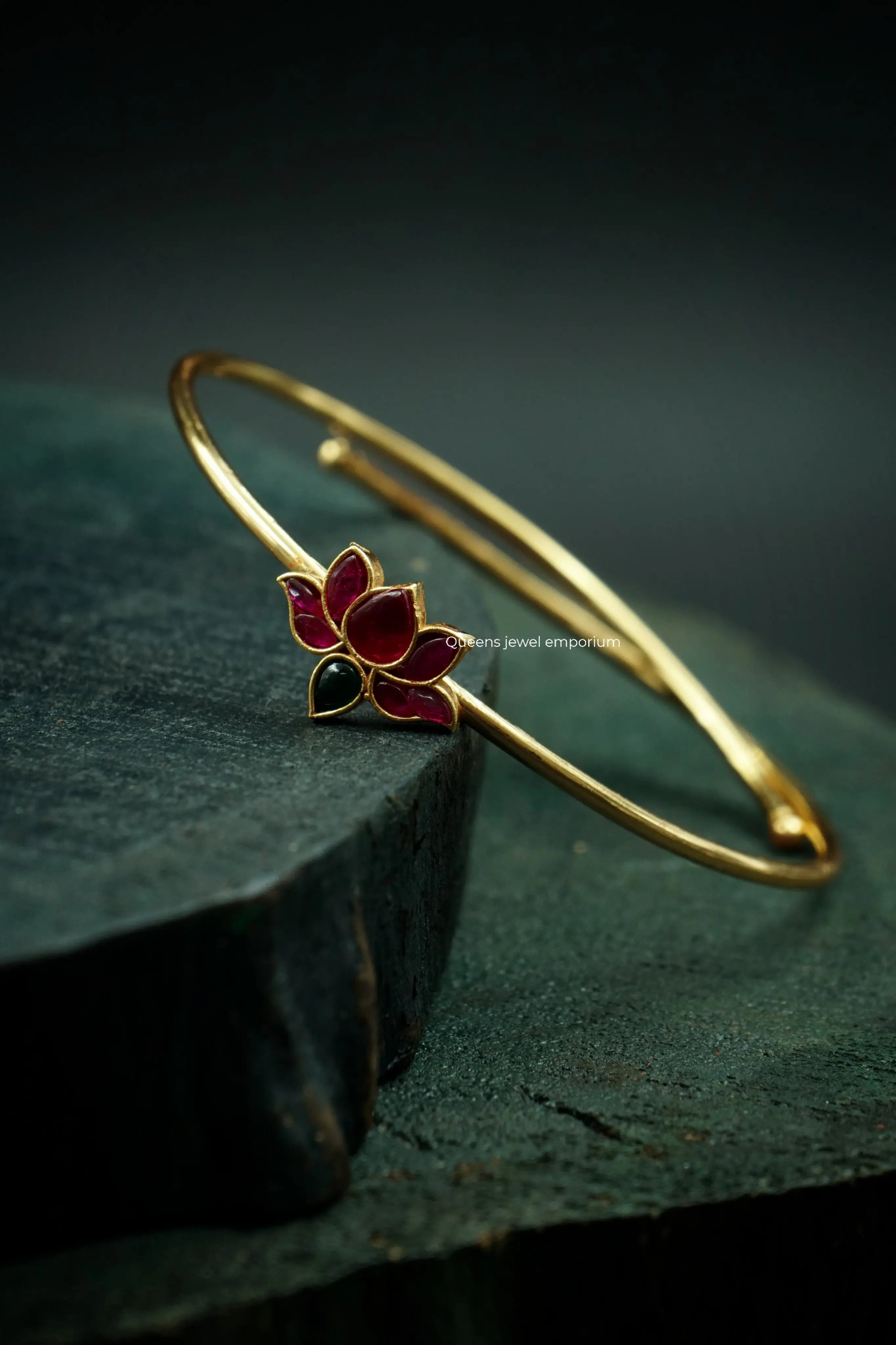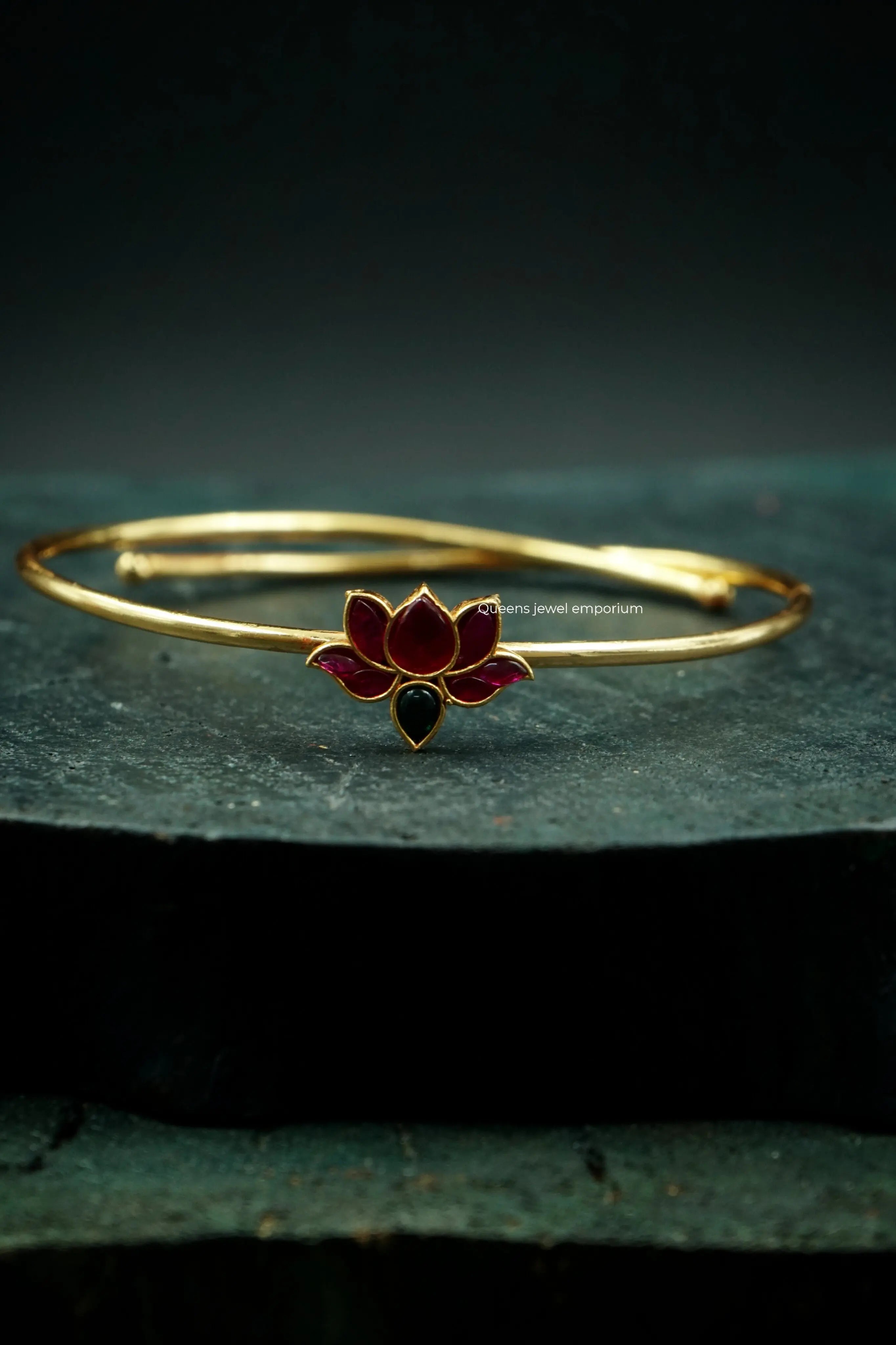 Introducing the Yoshini kemp vanki, a stunning South Indian bangle adorned with intricate handmade designs and sparkling kemp stones. Made of high-quality gold plating and silver alloy, this timeless piece will elevate any ensemble. Enhance your traditional look with the lotus motif and exquisite craftsmanship of this bangle.